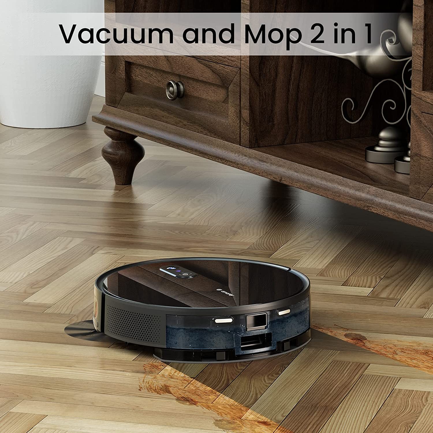 45 Days Hands-free Cleaning: The robot vacuum is equipped with a 2 in 1 auto-empty dock and charging base, emptying itself into a large 3L dust bag that has the capacity to collect weeks of dirt. It helps you dispose of dust, pet hair, and other debris in your home without lifting a finger. Vacuum and Mop in One Time: Amarey combo robot vacuum and mop adopts a 300mL water tank, which can clean up to 500 square feet. Additionally, you control the rate of water flow through the app to reach a balance of moistness and quick-drying, and the damp pad cleans your vacuumed hard floors. Smart Mapping: Amarey A90+ vacuum robot features visual navigation to map your room and plan an efficient cleaning route. It allows to clean the targeted area and set up a No-go zone. Moreover, you can choose to schedule cleanings when you are not at home. 3000Pa Strong Suction with Low Noisy: The Amarey robotic vacuum cleaner uses a brushless motor to greatly reduce the vacuum noise under 58 dB. A great option for vacuuming your pet hair in the carpet with its 3000Pa powerful suction. Plus, two side brushes can largely collect debris along the wall. Automatic Recharge and Long Runtime: Amarey robot and mops for floor cleaning will return to the base to recharge itself if it runs low on battery. The battery holds a charge for 110 minutes of run time which is long enough for most sizes of room. But the runtime differs from the cleaning mode you choose. What you can get: 1x Amarey robot mop and vacuum, 1x Self-emptying base, 1x Rolling brush, 4x Side brush, 1x Efficient filter, 1x 2-1 Dust and water tank, 2x Dust bag, 1x Mopping module, 1x User guide and 24 Months worry-free warranty.