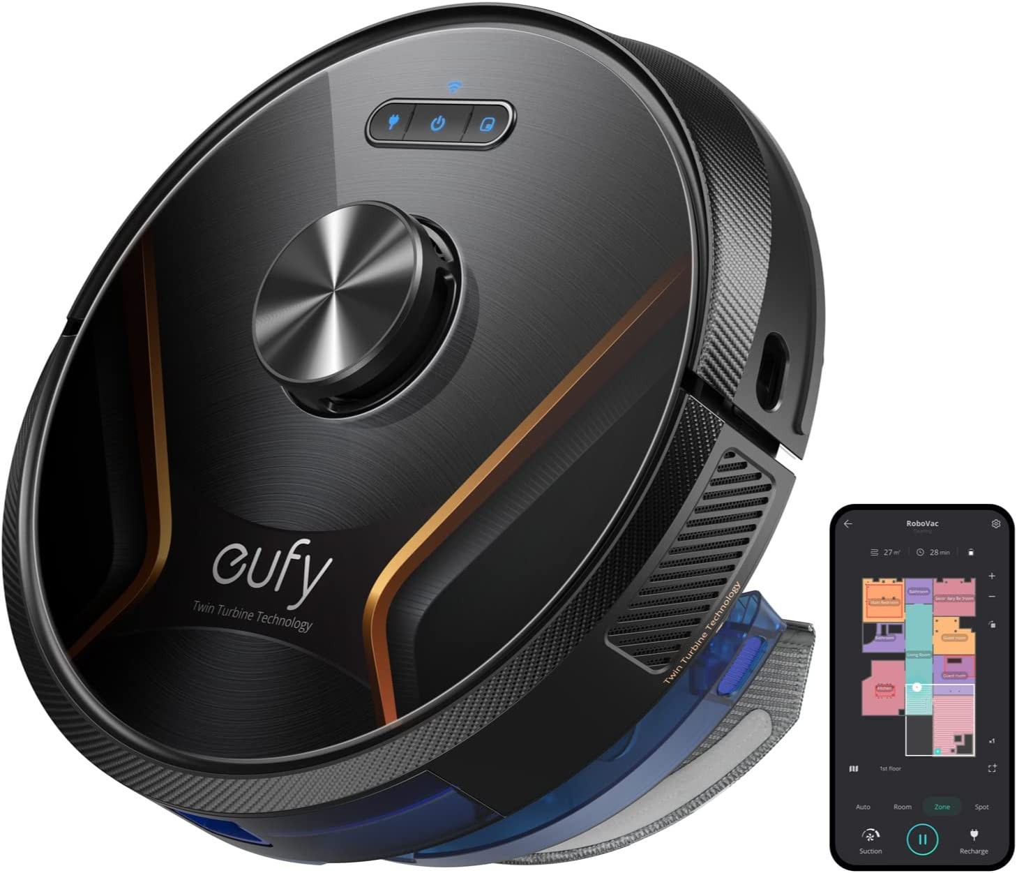Twin-Turbine Technology: With each turbine generating 2000 Pa of suction power, RoboVac X8 Hybrid creates up to 80% more airflow* to pick up more dust, debris, and pet hair from every corner of your house. *When compared to eufy´s single-turbine robotic vacuum.