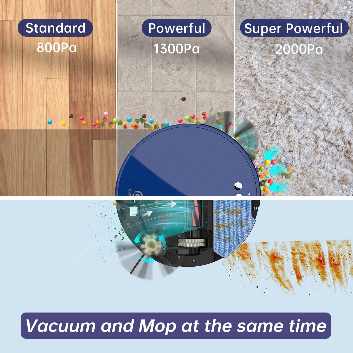[“?+?” ???????? ?????] OKP K8 robot vacuum supports 4 cleaning modes, including: “Auto clean” “Random clean” “Along-edge clean” “Spot clean”. At the same time, OKP adds two new functions: “schedule cleaning time” and “Manual control cleaning”. OKP will provide you with intelligent cleaning. [??????? ??????????? ????????] You can use the “OKP” application to create a cleaning plan, even if you are not at home, you can clearly see the cleaning process and the cleaning path of the robot vacuum and mop through the app, and the cleaning plan can be adjusted at any time. [????? ????? ???????] 2000Pa suction can easily complete household cleaning tasks, K8 robot vacuum cleaner is not only suitable for hardwood floors but also has a very good cleaning effect on low pile carpets. [? ?? ? ?????? ??? ??? ?????] The integrated dust box of the K8 robot mop is divided into two parts: the water tank (0.16L) and the dust box (0.5L). There are 3 different water discharges that can be selected on the app. [??????? ???????? ??????????] Built-in anti-collision smart sensor and ground detection smart sensor, while enjoying smart cleaning, it better protects the robot vacuum cleaner. [????] Please read the manual carefully before using the robot vacuum and mop combo.