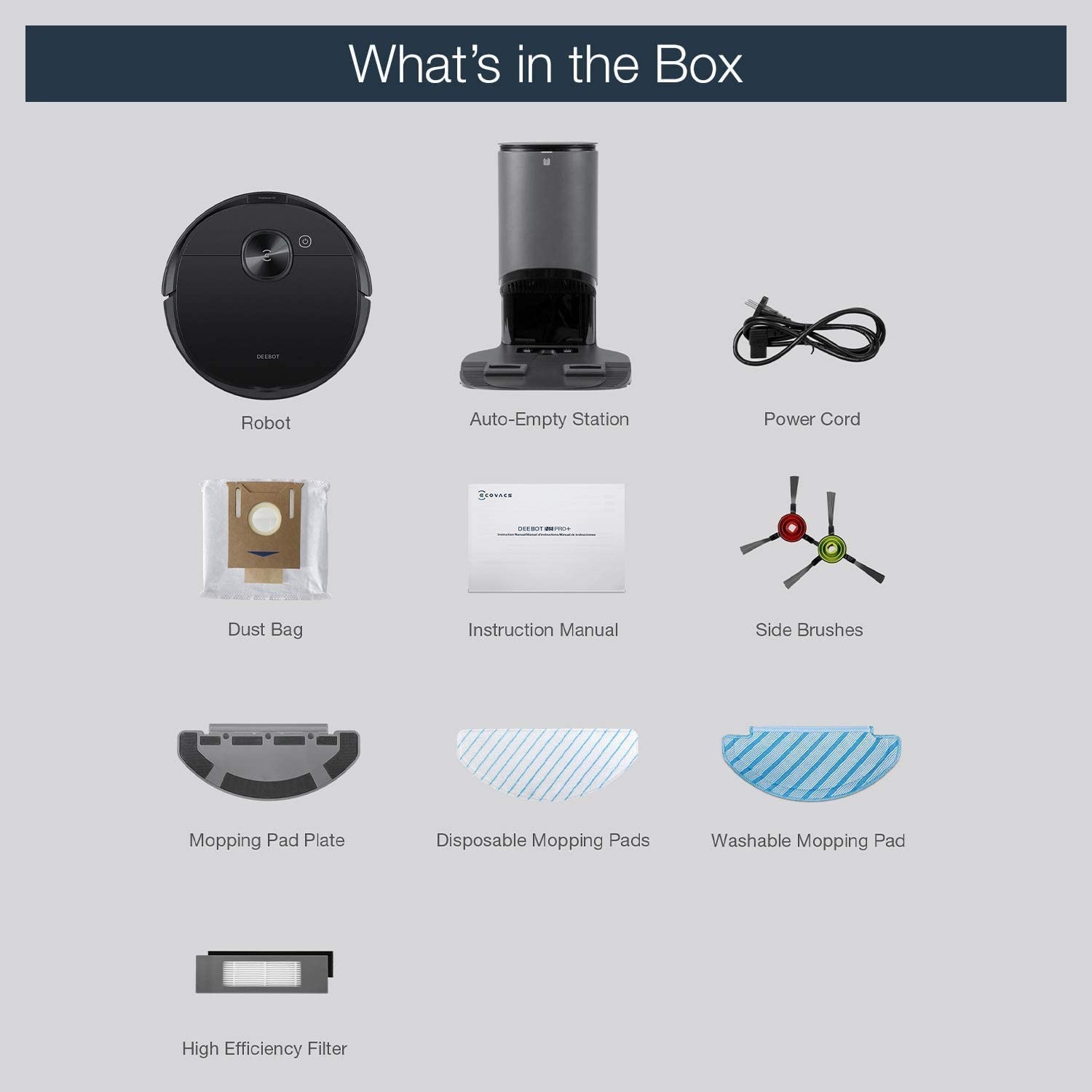 30-Day HANDS-FREE CLEANING WITH SELF-EMPTY STATION. ECOVACS DEEBOT N8 Pro+ automatically self-empties its dustbin after cleaning. The station’s disposable dust bag holds up to months of dirt and debris. (1 Spare Dust Bag Included). VACUUMING AND OZMO MOPPING IN ONE-GO. Plus, automatically avoids carpets when mopping hard floors and doubles the suction power when vacuuming carpets. CLEAN MORE EFFECTIVELY WITH SUPERIOR 2600Pa SUCTION that draws out dirt and dust from wherever it’s hidden in your hard floors and carpets, while optimizing energy and maintaining low noise levels. HASSLE-FREE CLEANING WITH TRUEDETECT, a laser-based 3D technology that lets N8 Pro+ detect and avoid objects such as cables, slippers and pet mess to reduce the risk of getting stuck. CLEAN MORE EFFICENTLY WITH TRUEMAPPING, an advanced laser-based LiDAR navigation with aerospace-standard dToF detection sensors, generate maps with 4X greater precision and 2X greater range than standard laser mapping to ensure the fastest and most efficient cleaning path. BOX CONTENTS: (1) DEEBOT N8 Pro+ Robot, (1) Auto-Empty Station, (2) Auto-Empty Station Bags, (1) Washable Mopping Pad, (10) Disposable Mopping Pads, (2) Side Brushes, (1) High-Efficiency Air Filter, (1) Instruction Manual. 12 months Limited Warranty