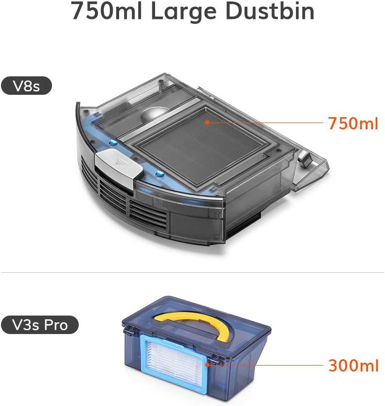 【Large 750ml Dustbin】: A large dustbin ensures the V8s clean larger spaces without frequent emptying.
