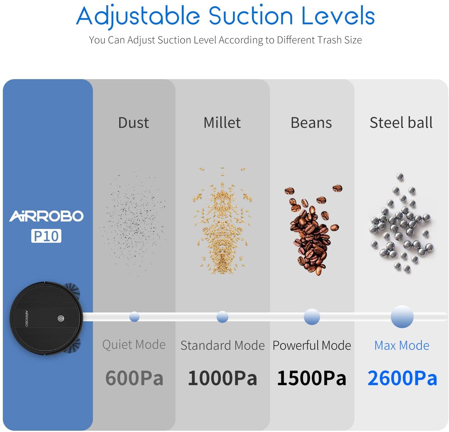 Breathtaking Suction: 2600Pa of strong suction picks up debris, pet hair and food scraps from hard floor and low-piled carpet more effectively and powerfully, bringing you an effortless clean. 4 levels of suction power are specially designed to meet your different cleaning needs. Smart App and Voice Control: You can easily set up cleaning schedules, change the clean modes, select suction modes and control the cleaning direction by using the Tuya app. The automatic vacuum cleaner robot is also compatible with Alexa and Google Assistant, you can start or stop cleaning via a simple voice command. Built in Japanese Brushless Motor: The Latest brushless motor technology makes AIRROBO P10 more reliable, longer lifespand, less noise, and more energy-efficient. Safe and Thorough Cleaning: Sensitive anti-collision and drop-sensing sensors prevent robot vacuum from colliding furniture and tumbling down stairs.A super-slim 3.1in tall design allows the robot vacuum to reach under beds, sofas, and other areas where dirt hides to help thoroughly clean your floors. Self-charging: AIRROBO P10 goes back to charging dock automatically when the battery power runs low or cleaning job is done.