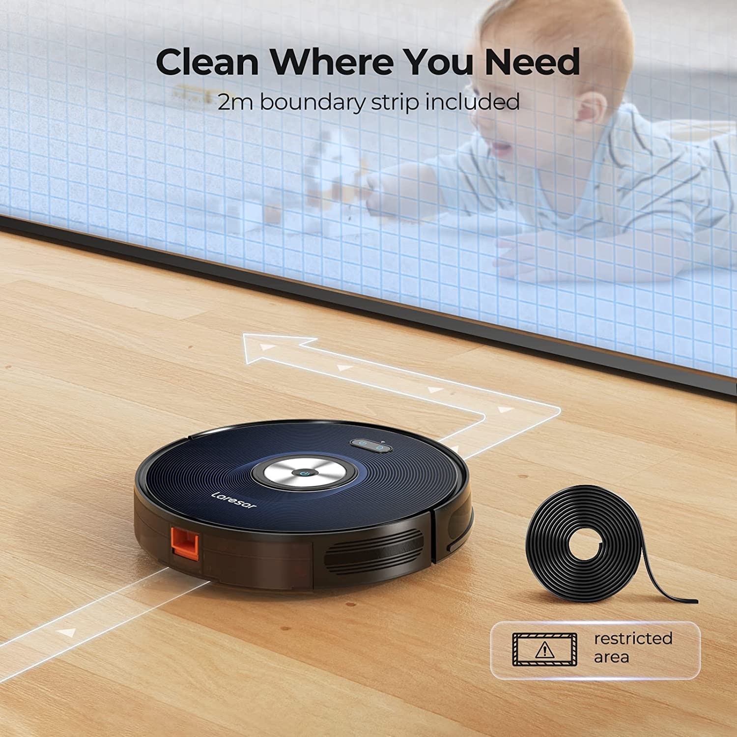 【App Control & Schedule Cleaning】Easily connect the robot to your phone via Wi-Fi. You can set schedule cleanings, change different clean modes and control the cleaning direction via the Laresmart app or the remote controller. You can also view the cleaning track on the APP.
