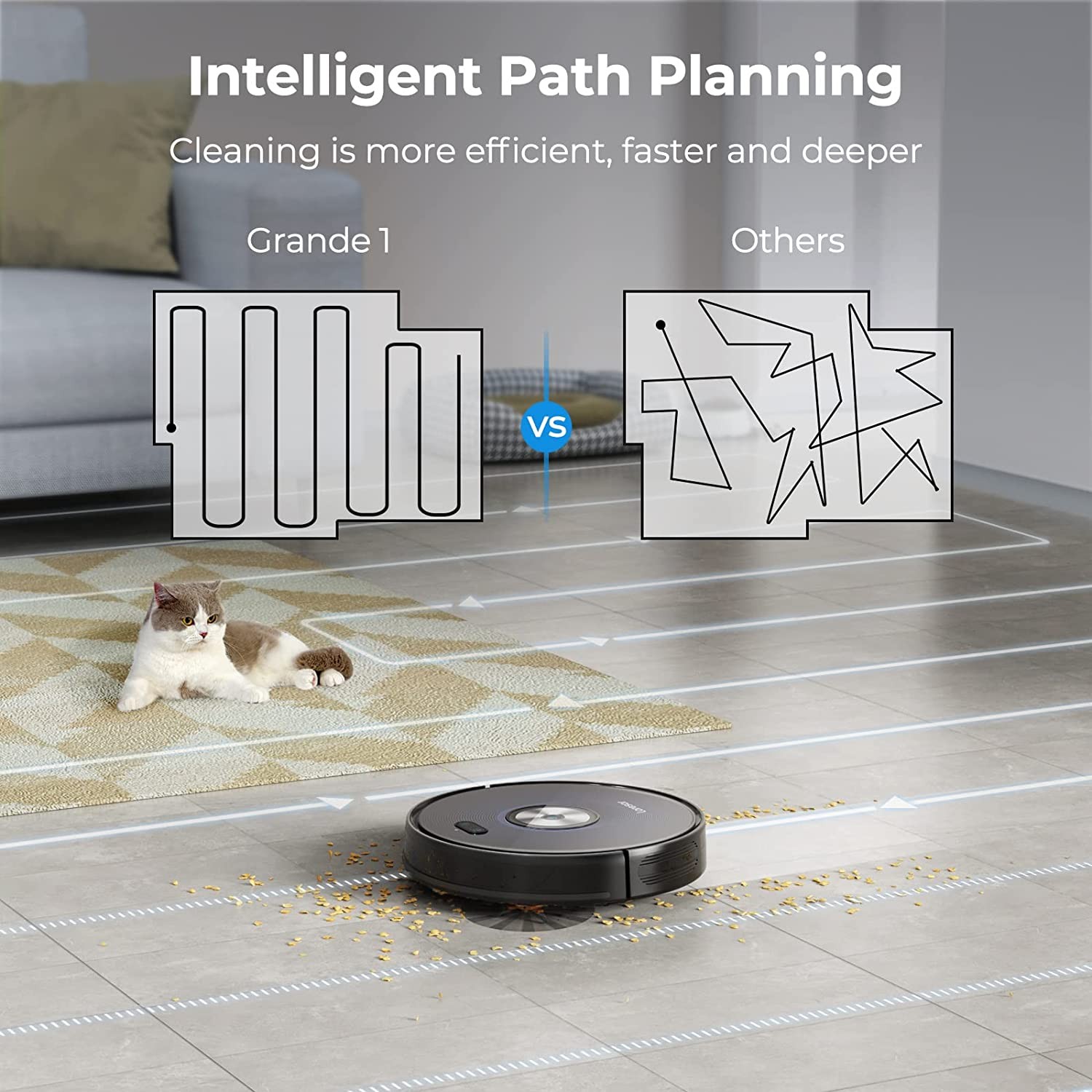 【3200mAh Battery & Self-Charging】Grande 1 automatic vacuum cleaner adopts a 3200 mAh large-capacity battery. Running time is up to 140+ minutes per full charge, bringing it up to the challenge for any housing size. It will also self-charge when cleaning is complete or the battery level is below 15%.