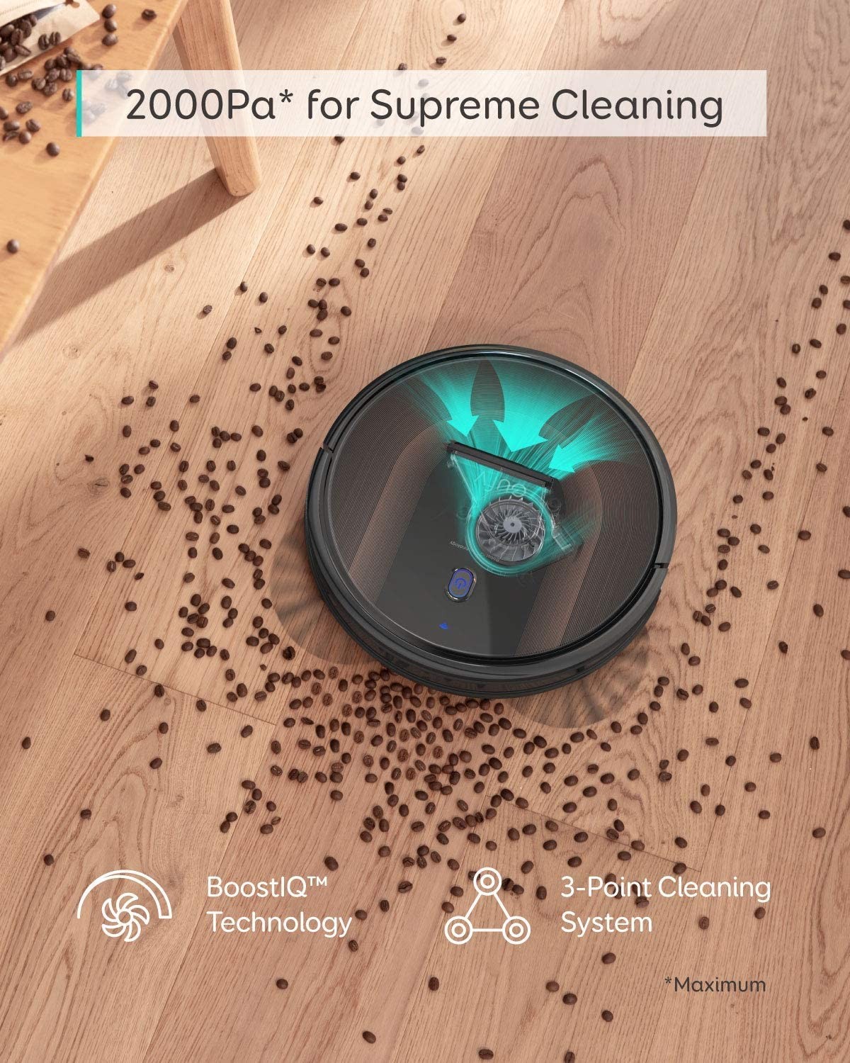 Super-Slim RoboVac: The 2.85" slim RoboVac boasts an intense suction power (up to 2000 Pa) while maintaining quiet operation. Wi-Fi Convenience: The eufy Clean app, Alexa and the Google Assistant voice control-services let you accomplish your vacuuming needs with zero effort from you. BoostIQ Technology: RoboVac automatically increases suction power within 1.5 seconds when extra vacuuming strength is needed for deep cleaning. Set Boundary Strips: RoboVac uses specialized dual-Hall Sensors to detect the Boundary Strips you set, ensuring it only cleans the areas required. What You Get: RoboVac 30C MAX, 13.2 ft Boundary Strips, remote control (2 AAA batteries included), charging base, AC power adapter, cleaning tool, extra set of high-performance filters, 4 side brushes, 5 cable ties, welcome guide, and our worry-free 12-month warranty.