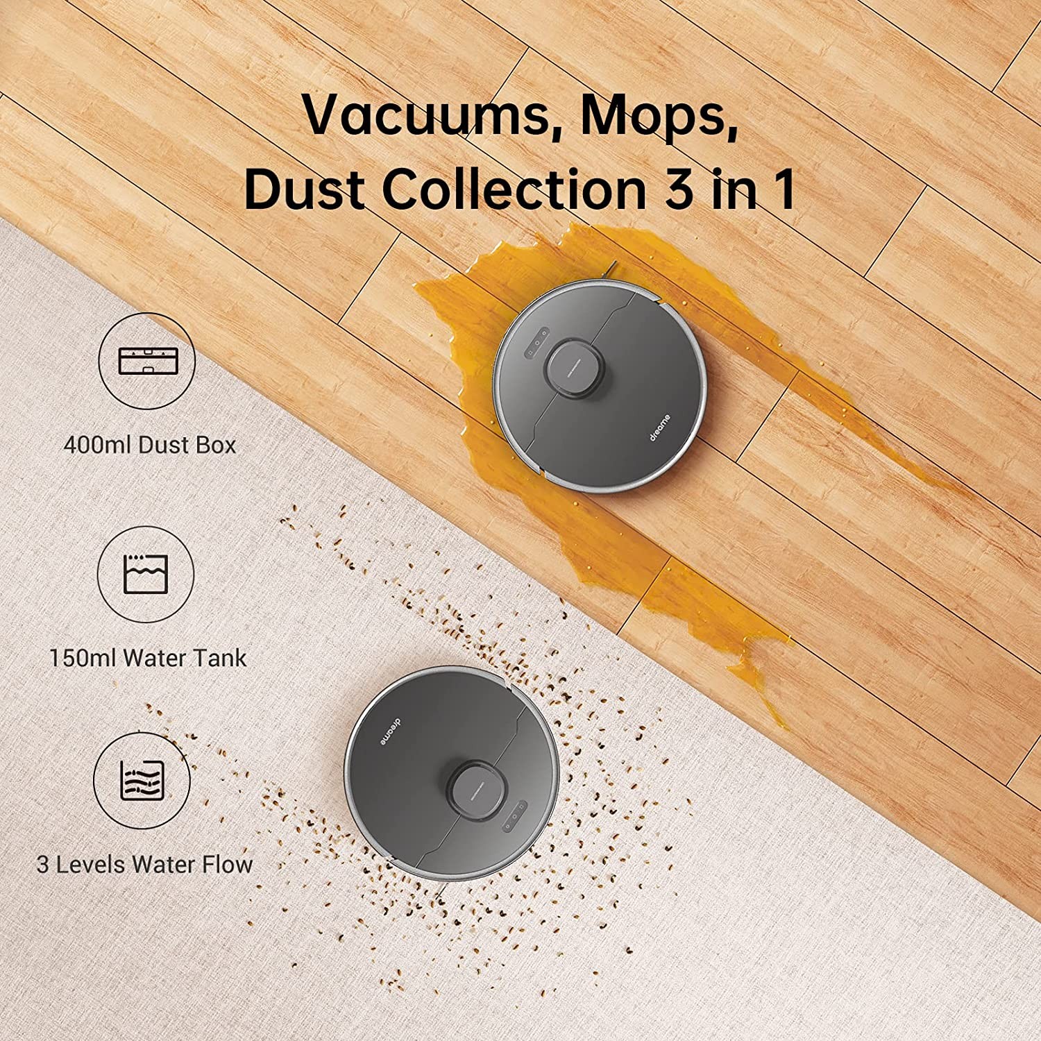 Sweeping and Mopping Configuration: 400ml dust box + 150ml electric water tank with 3 levels of water volume can be adjusted, which controls the water level precisely and removes stains effectively
