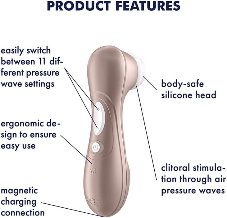 Unforgettable: The iconic Satisfyer, the world's favorite, merges pressure waves and vibrations with revolutionary Airpulse technology for an exhilarating climax like never before.<br>Quality: Being a German company with a worldwide reputation as a sex shop, we place great emphasis on ensuring quality and safety.<br>Features: Experience intense pulsations coupled with highly erotic vibrations across 11 distinct pressure wave intensities, creating a magical effect on your sensitive areas.<br>Practical: Thanks to its thoughtfully designed ergonomic shape, the Satisfyer Pro 2 effortlessly fits into your hand, ensuring a comfortable and intuitive grip.<br>Material: The Satisfyer Pro 2 features a medical silicone material that ensures it is gentle and non-irritating to the skin, delivering a soft and comfortable experience.