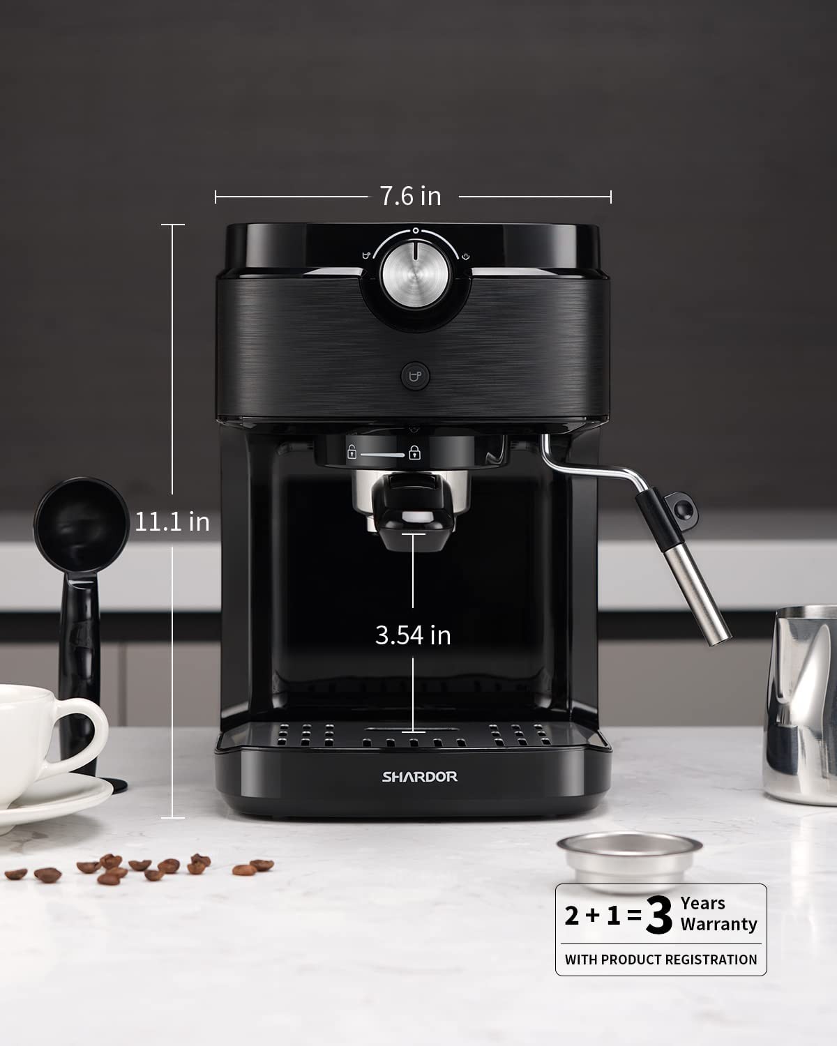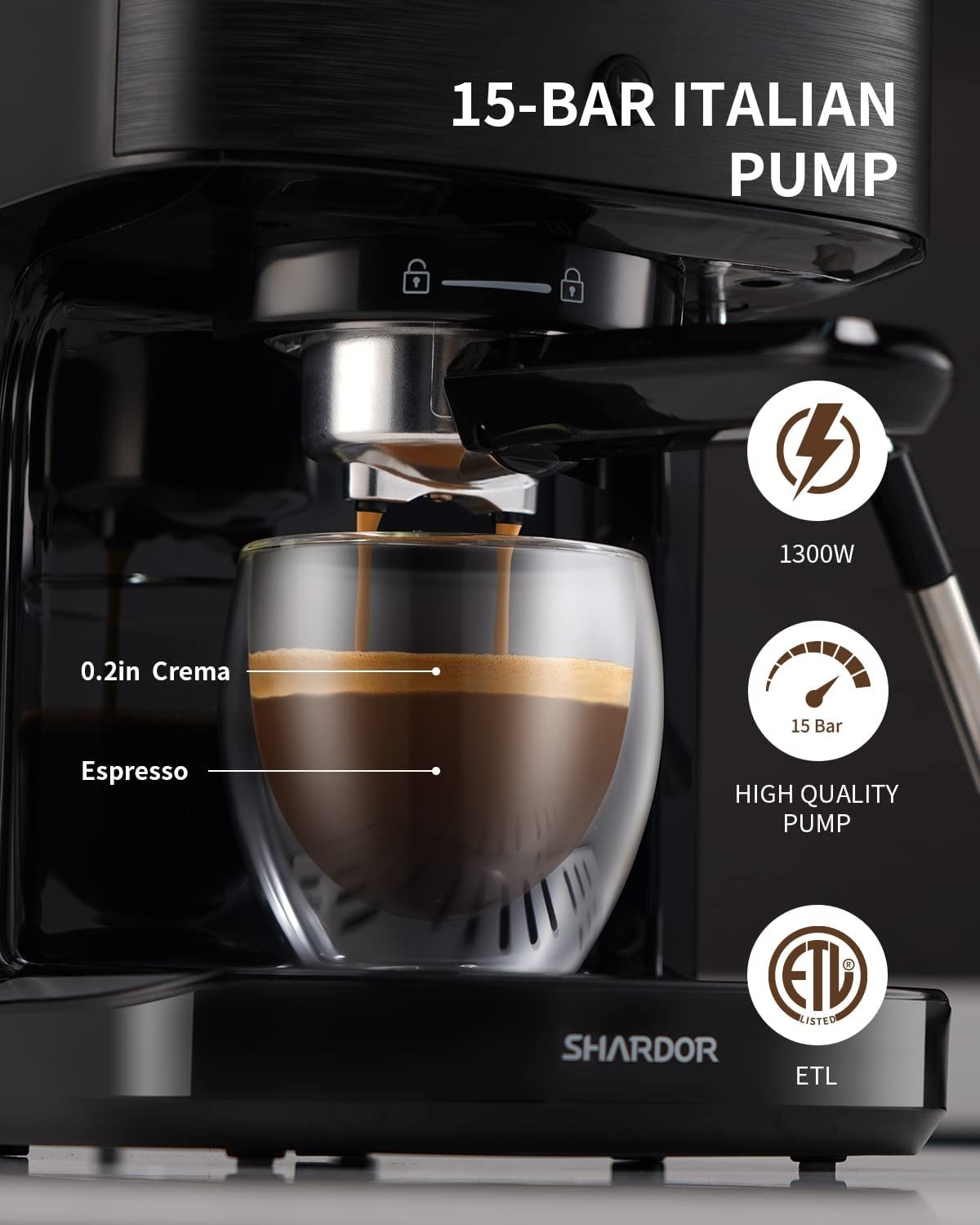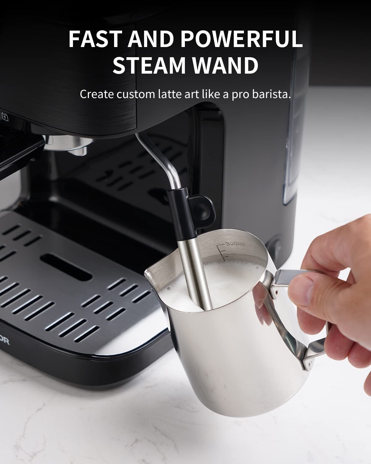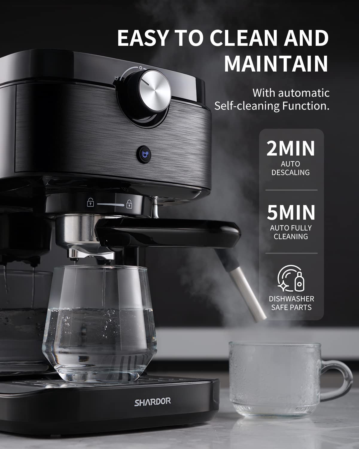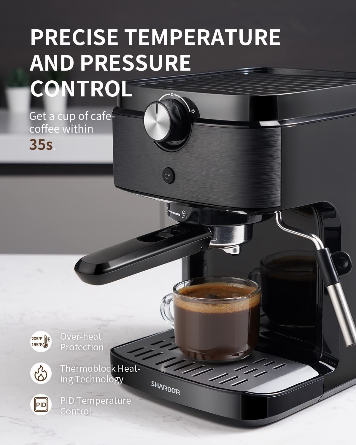 【15-Bar Italian Pump】 15-Bar Italian pump delivers the right amount of pressure for maximum flavor extraction and produces a beautiful layer of Crema for your Espresso. 【Create custom latte art like a pro barista】 Manual steam wand can create rich creamy froth and latte art. Create a rich, creamy froth of evenly drinks just the way you like. Make delicious foamy creamer for your drink at home without a trip to cafe, with your own espresso machine. 【Precise Temperature and Pressure Control】Thermblock heating technology and PID temperature control delivers even heat for consistently great-tasting Espresso, and pre-infusion gently blooms The espresso grounds for optimally extracted Espresso. 【One Espresso Shot or Two】Includes a single and double shot stainless steel filter to choose your espresso shot size. 1 Shot-Brew about 40ml/1.35oz amount of coffee. 2 Shot-Brew about 80ml/2.7oz amount of coffee. Press and hold the button for 3s to make a double cup of espresso coffee.(Blue light for single shot, Purple light for double shots.) 【The easiest machine to clean and maintain】Just pop out the drip tray and the water tank and put them in the dishwasher. Plus, it features auto descaling and auto full cleaning function. Descaling lasts for 5mins, Auto Fast cleaning for 2mins.