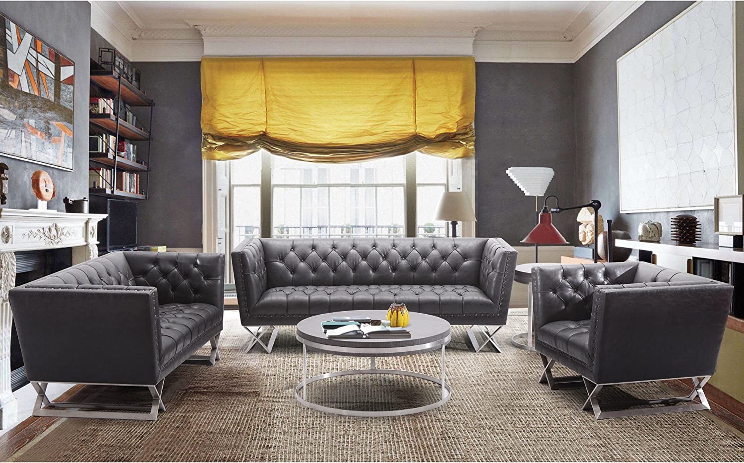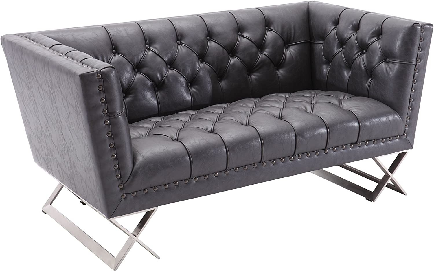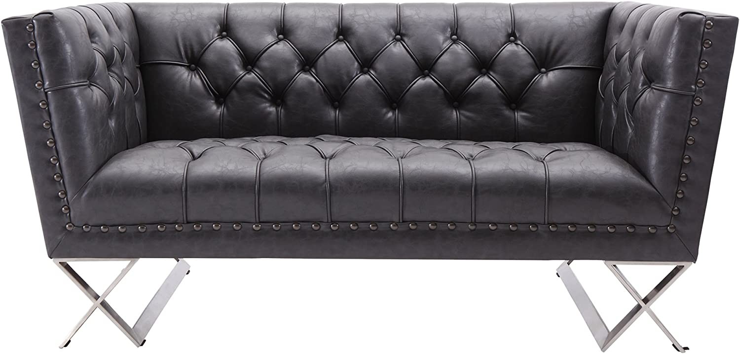 Armen Living Odyssey Loveseat in Brushed Steel Finish with Vintage Black Pu Upholstery and Silver Nail Heads