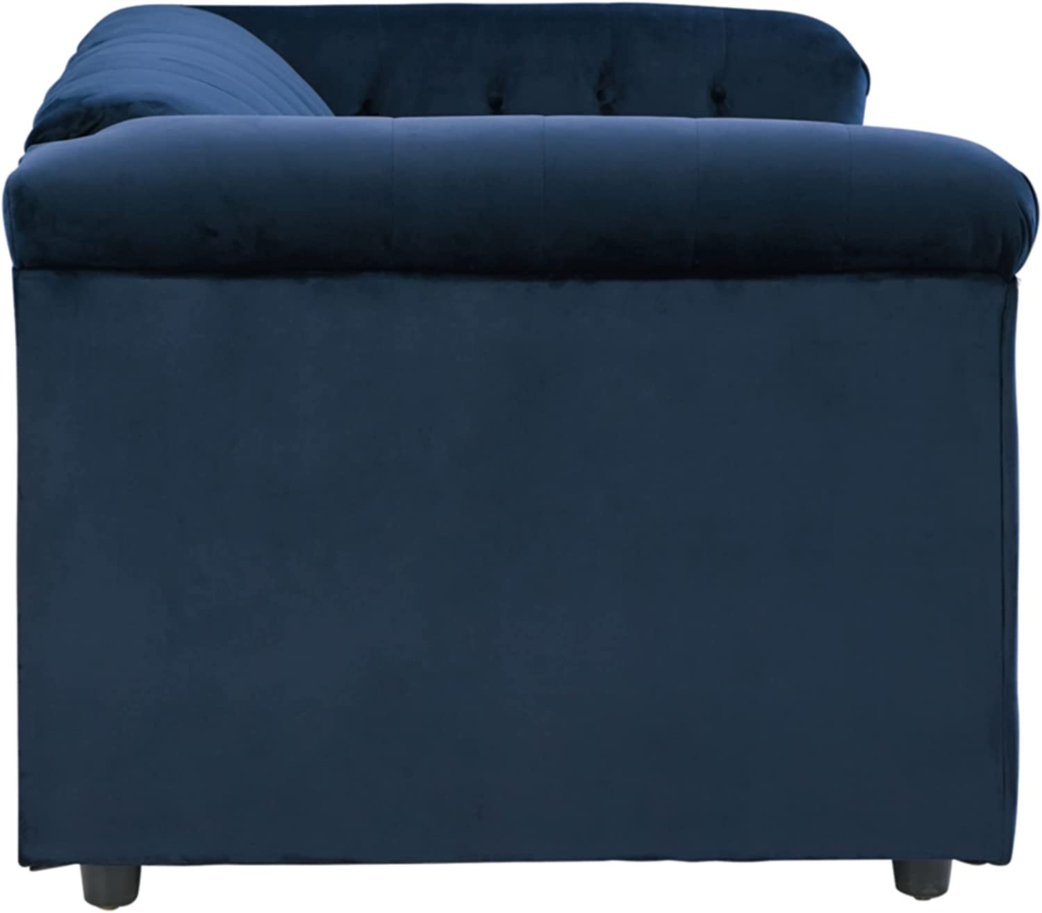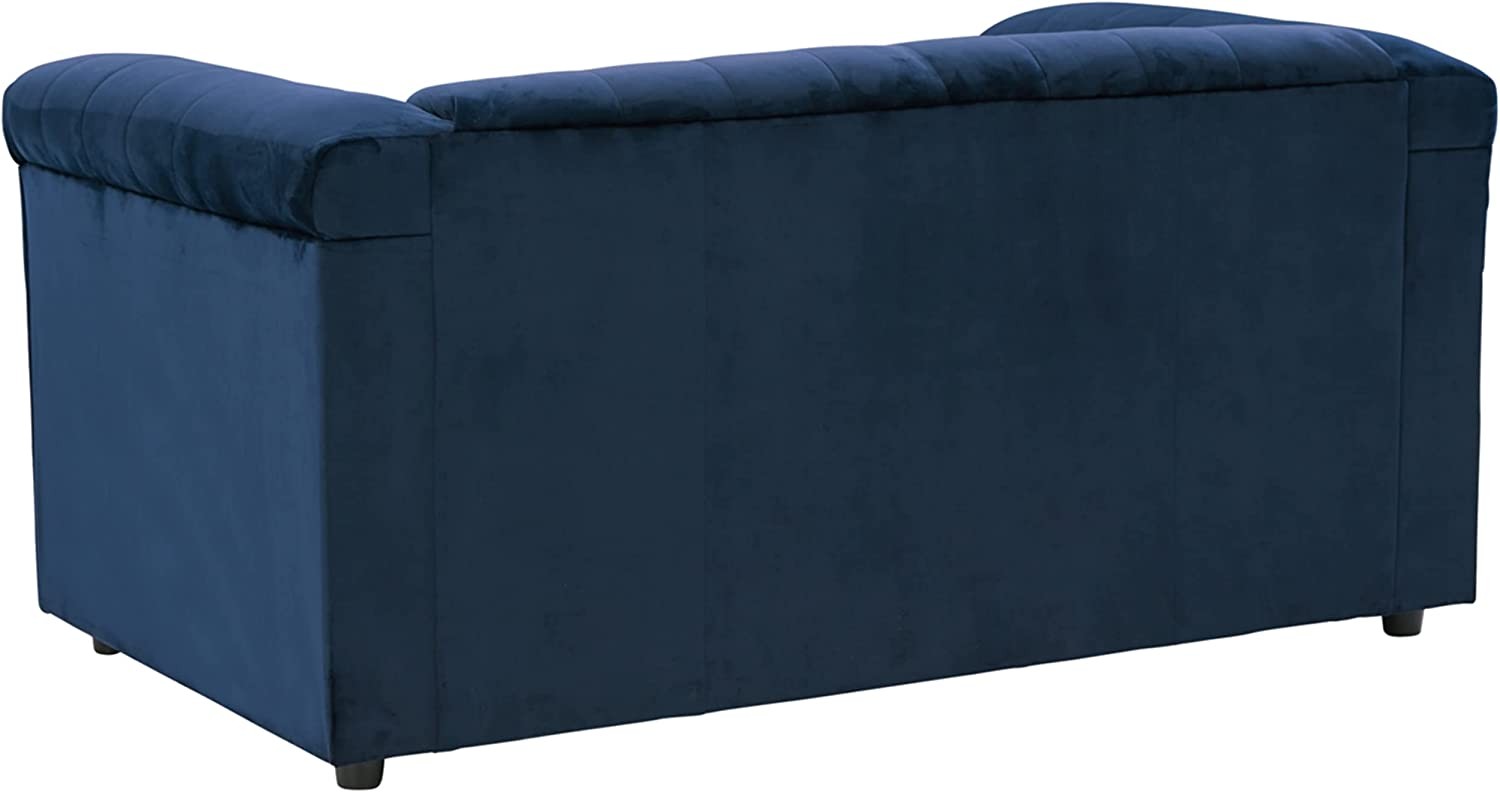Polyester 100% CONTEMPORARY LOVESEAT: Bringing classic Chesterfield styling into the current century, this brilliant loveseat will beautifully accent your existing on-trend furniture pieces CUSHIONED COMFORT: Impossibly soft to the touch with navy polyester velvet upholstery. Delightfully plush with high-resiliency foam cushions wrapped in thick poly fiber REFINED DETAILS: Nailhead trim, button tufting and high shelter arms give this loveseat an effortlessly elegant appeal. Hidden leg design is on trend for modern spaces INSTANT STYLE: Making a modern statement in your living room set next to a sofa or pair of chairs, this comfy chic piece measures 66" W x 37.5" D x 33.5" H ASSEMBLY REQUIRED: Easy-to-follow instructions and hardware included. Two people recommended. Screwdriver (not included) is required for assembly