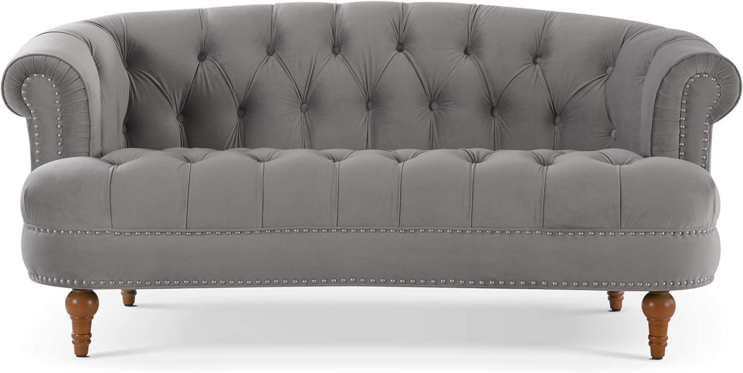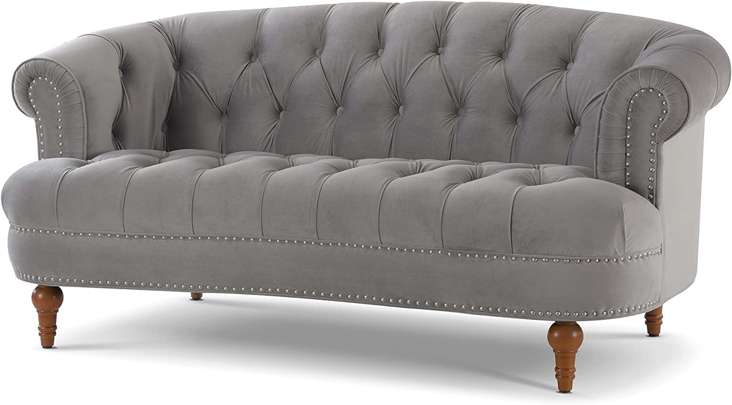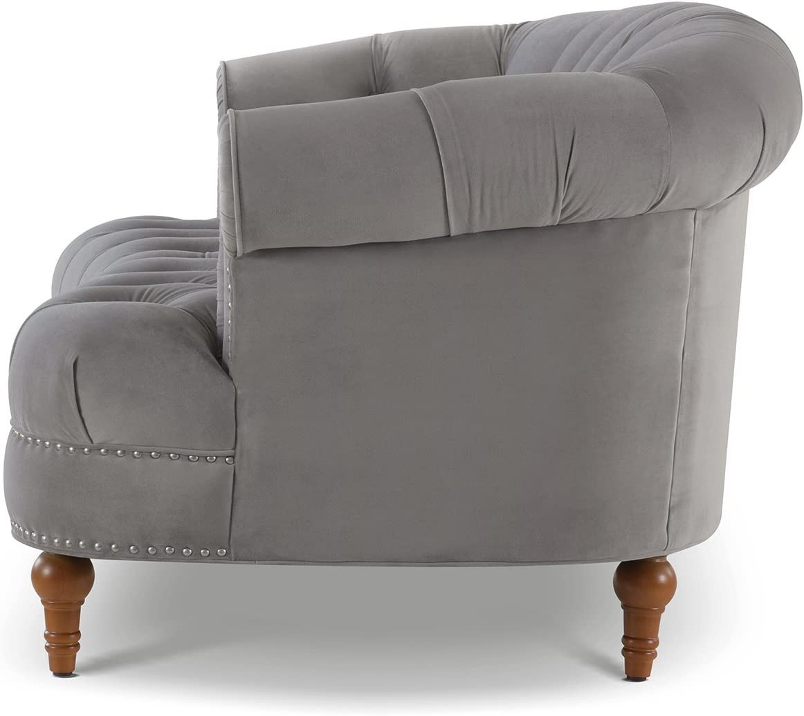 Jennifer Taylor Home La Rosa Victorian Chesterfield Loveseat, Opal Grey, 100% Polyester, Velvet, 69 L x 40 W x 32 H Bench-made home furnishing products carefully hand built by experienced craftsmen and women A sturdy frame of kiln-dried solid hardwood and 11-layer plywood for strength and support that will last Upholstered in high-quality woven fabric atop premium high-density flame-retardant foam for a luxurious medium firm feel High-strength sinuous spring suspension for long lasting comfort and support