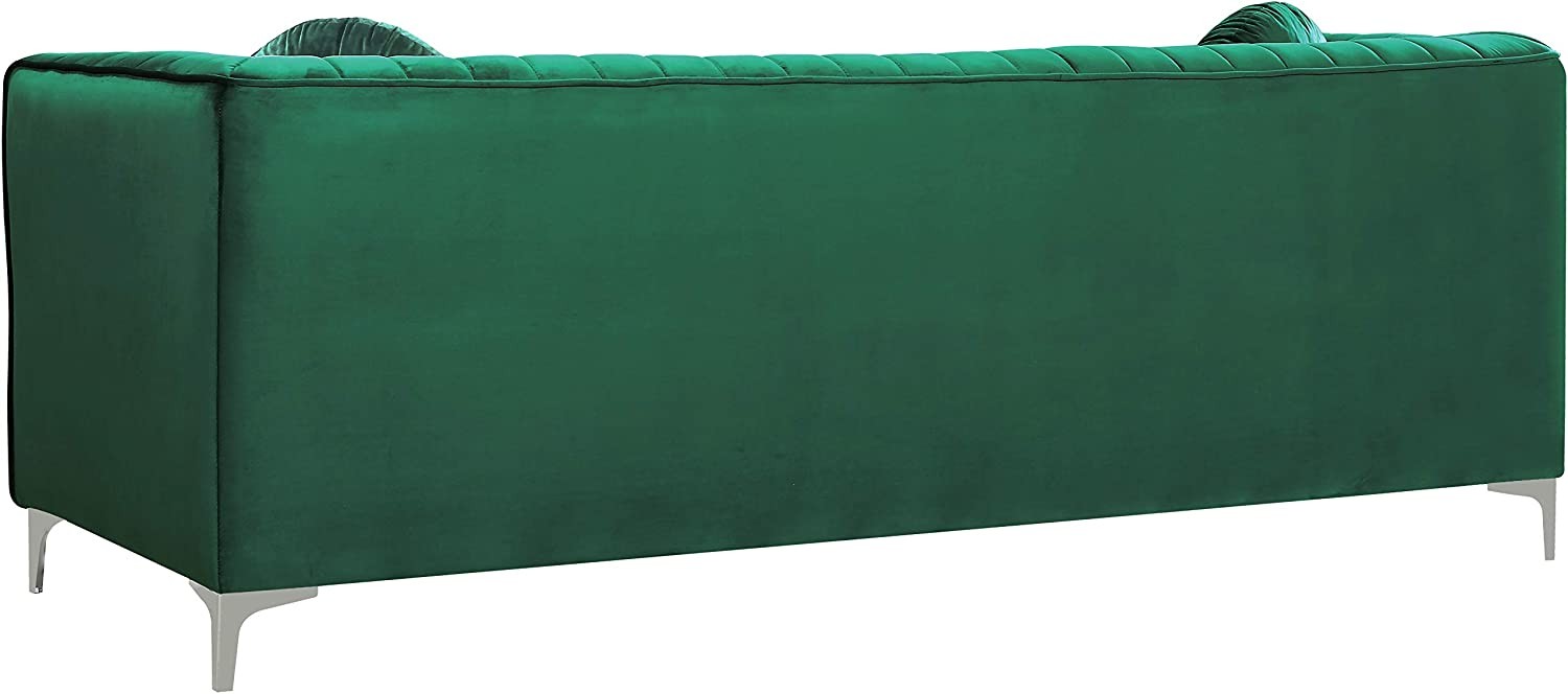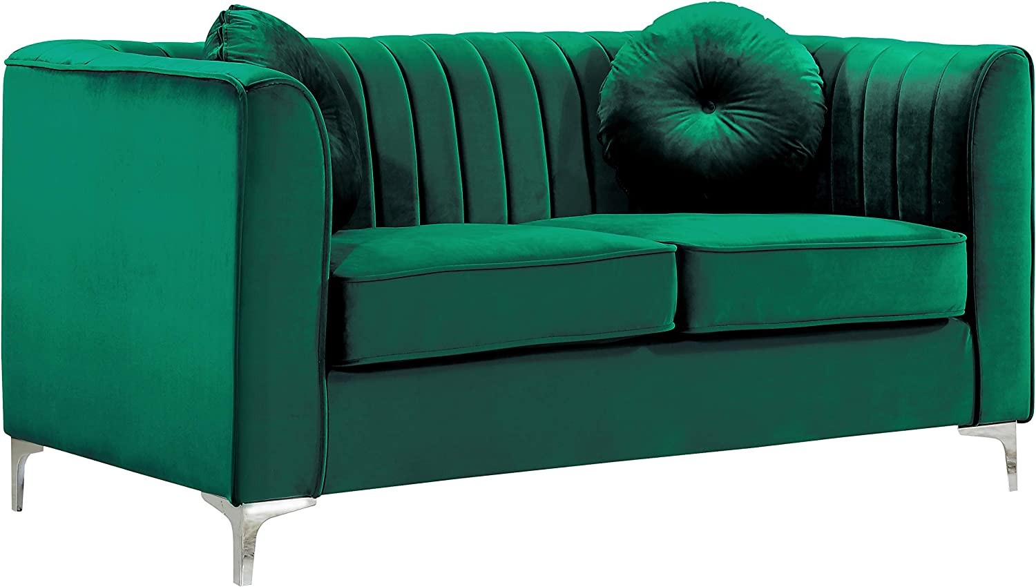 Meridian Furniture Isabelle Collection Modern | Contemporary Channel Tufted, Velvet Upholstered Loveseat with Custom Chrome Legs, Green, 62" W x 35.5" D x 31" H