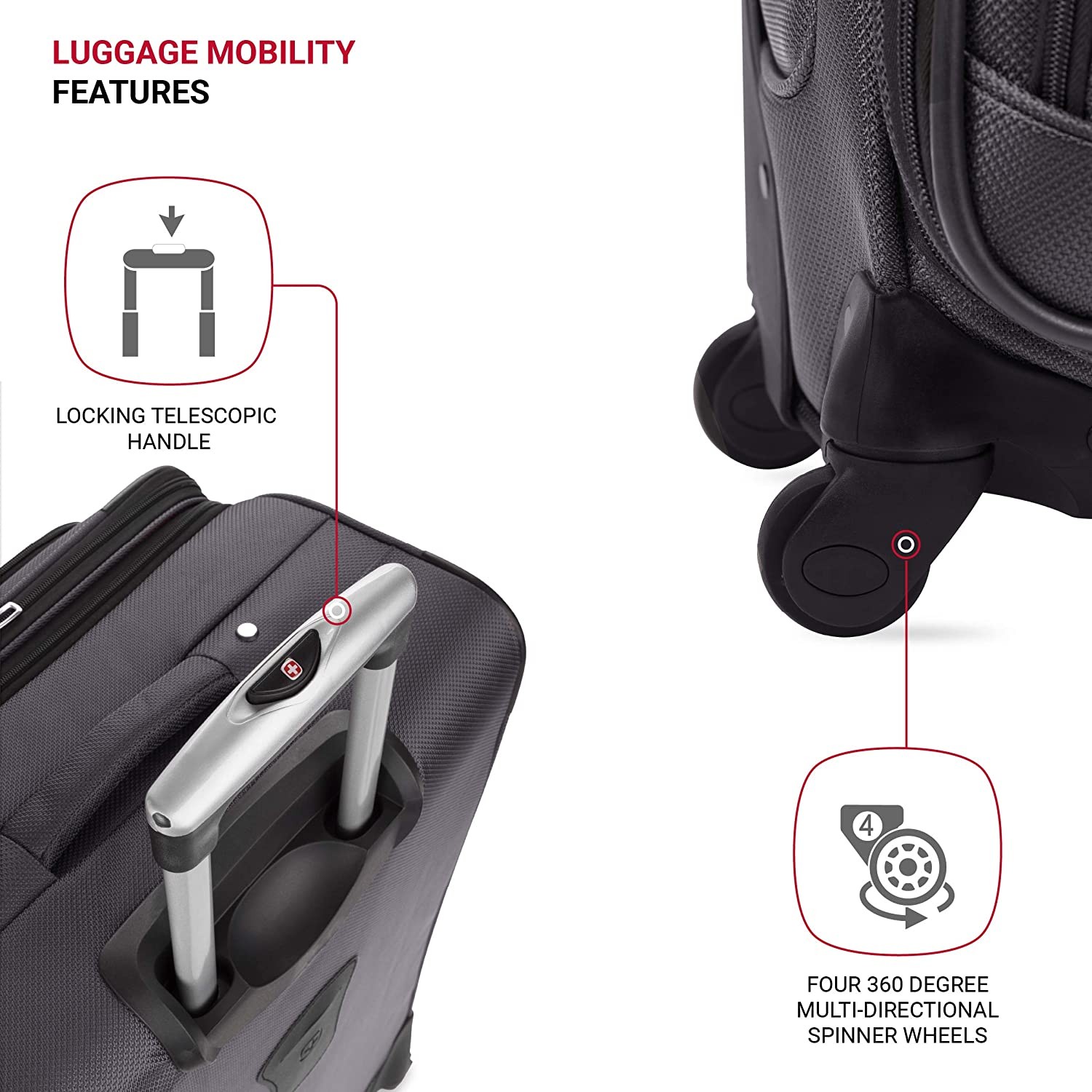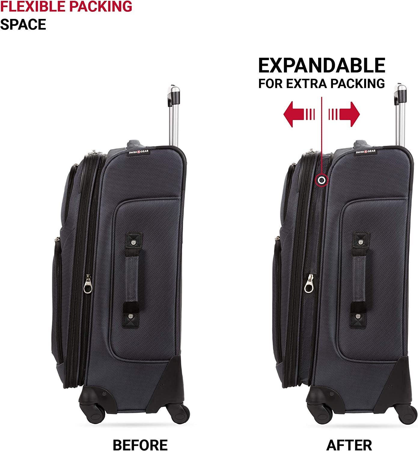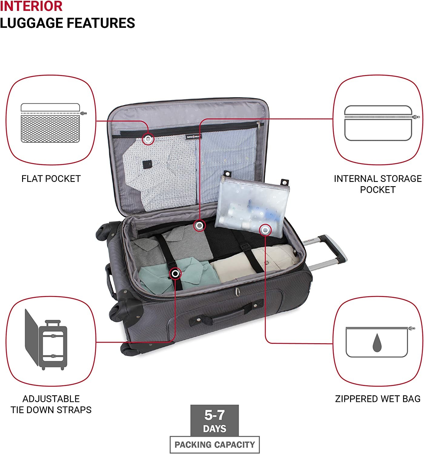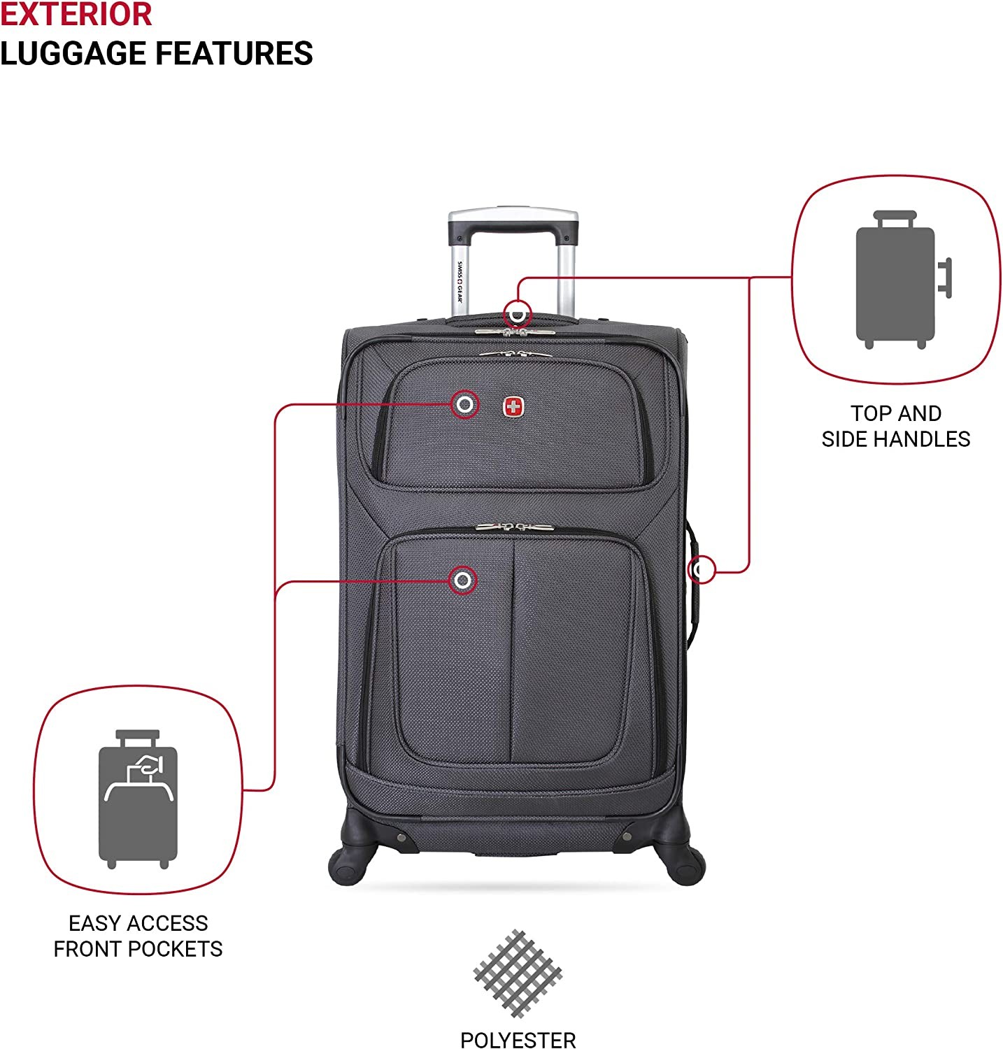 Rolling Suitcase: Get through a crowded airport easily with this stylish check-in luggage with 360-degree multi-directional spinner wheels and a locking retractable push/pull handle Multiple Front Panel Pockets: Featuring front pockets with a built-in ID tag, this ergonomically expandable luggage measures 26.25 x 16.75 x 11 inches including wheels and handles; packing dimensions are 24.5 x 15.25 x 11 inches Secure and Durable: Expandable travel case gives you ample parking space and made from a durable, scuff-resistant polyester fabric with fully lined interior; also features adjustable tie-down straps for securing garments in place Effortless Organization: This luggage bag maximizes packing efficiency with a removable zippered wet bag, large mesh lid pocket, and packing pocket for holding small items and accessories Convenient Side Handles: With reinforced padded top handle with an integrated side and bottom handle, this roller suitcase makes lifting and carrying your luggage easy