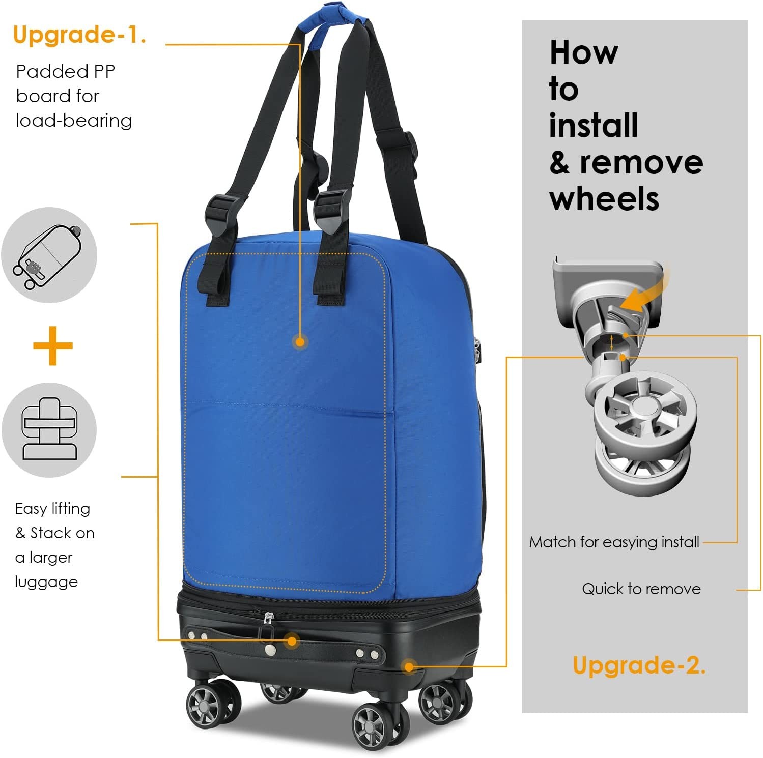 UPDATE REMOVABLE DOUBLE SPINNER WHEELS: Effortless 360 degree upright rolling. Well balance under heavyweight. Detachable wheels extends service life