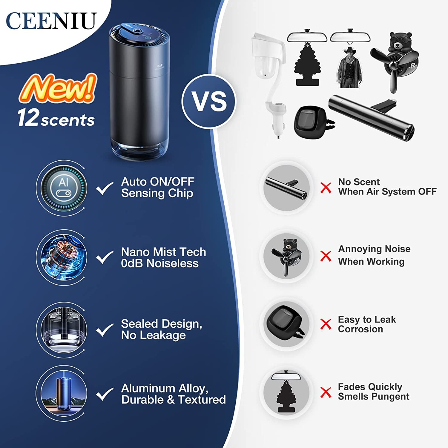 ✅【Worry-free】You can also get a 2-year return guarantee and lifetime technical and after-sales support. If you have any problems during shopping or use, please feel free to message us through Amazon. We will help you solve the problem within 12 hours. ?【Long-lasting】Isn't it troublesome to change the Car Air Fresheners in less than a week? The scent of Ceeniu Car Fresheners will not dissipate over time. If you turn it on for 2 hours a day in smart mode, you can avoid changing the perfume for 2 months. ?【Evenly】Is the scent concentrated only around the hanging paper? Ceeniu car diffuser uses ultrasonic atomization technology to spray perfume directly into the air, and the air freshener car can fill your car evenly at once. ?【Adjustable】Disgusted by the strong interior smell when you open the car? Ceeniu car air freshener has LIGHT and STRONG mode that can be adjusted according to your needs for fragrance. There's also a SMART mode that only sprays when you're driving. ?【Premium】Ceeniu's fragrances are sourced from the ROBERTET in France, a company that supplies spices to well-known brands like ChaneX and GuerlaiX. Only high-quality raw materials can provide the ultimate aromatherapy experience. ?【Luxurious】With the integrated aluminum alloy body and the polished mirror surface operation interface, Ceeniu car accessories can not only add a burst of fragrance to your car, but also light up your interior decoration, showing your high-end and unique taste. ?【High-tech】Ceeniu car fresheners for men & women is embedded with high-tech AI smart chips, which is responsible for adjusting the concentration, detecting the vibration of the vehicle to realize the Auto ON/OFF. You can get off the car without any unnecessary actions, and enjoy the convenience brought by tech. ?【Portable】Ceeniu smart car air freshener contains a 500mAh battery, so you can completely take it out of the car and take it anywhere you want: office desktop, yoga room, bedroom, etc. (No noise during operation.) ?【Gift-choice】If you are worried about what gift to give to someone with a car, a trendy technology fan or a friend who likes aromatherapy, why not present him a Ceeniu car fragrance? The package contains a diffuser, a bottle of classic cologne perfume, a type-c charging cable and a manual.