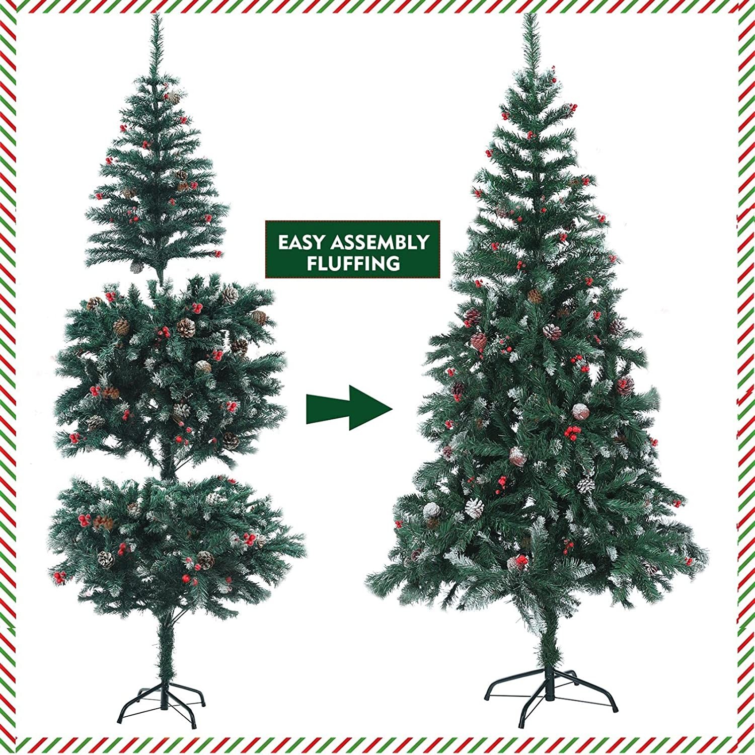 【Realistic Looking Tree】This Christmas pine tree with carefully crafted flocking snow design, green branches with pine cones and red berries, the overall color matching is bright, making the Christmas tree look richer and warmer, and making your family full of Christmas atmosphere