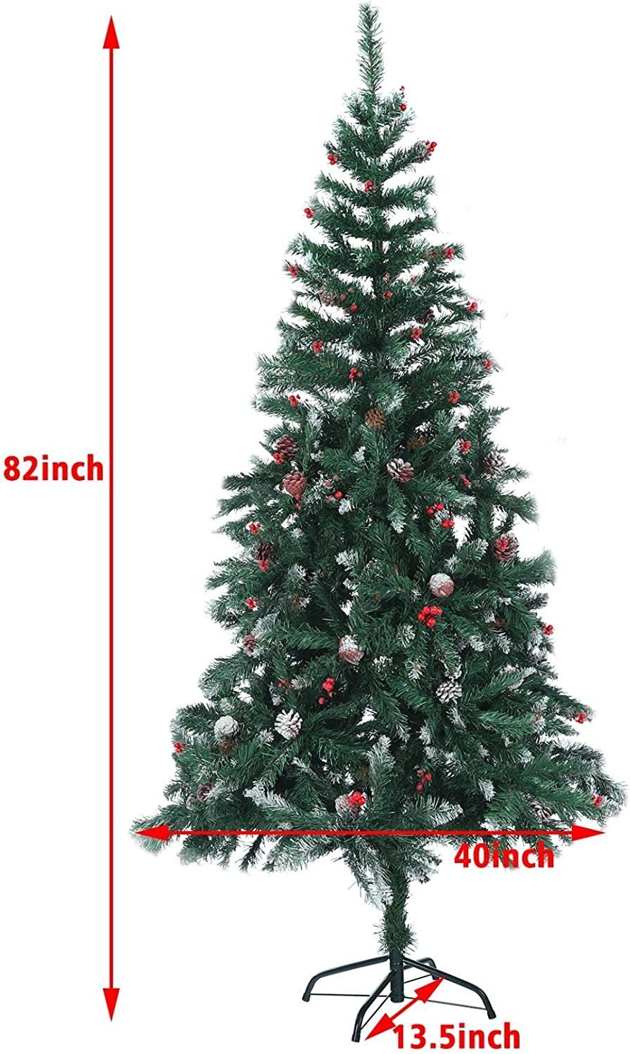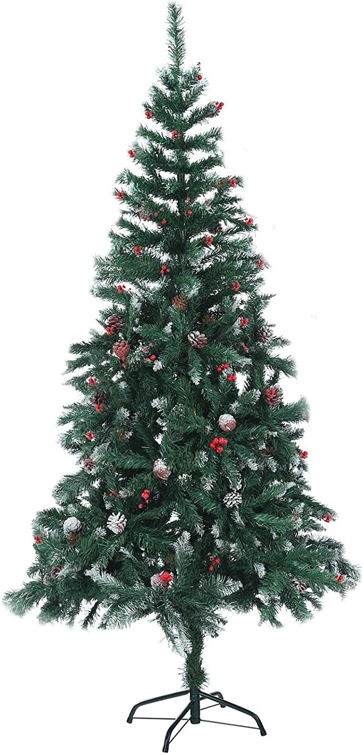 Soloven 6/7FT Premium Artificial Christmas Tree Snow Flocked Pine Xmas Tree Dector with 700 PE PVC Branch Tips Holiday Decoration Tree for Home Office Party,Pine Cones,Red Berries (7FT)