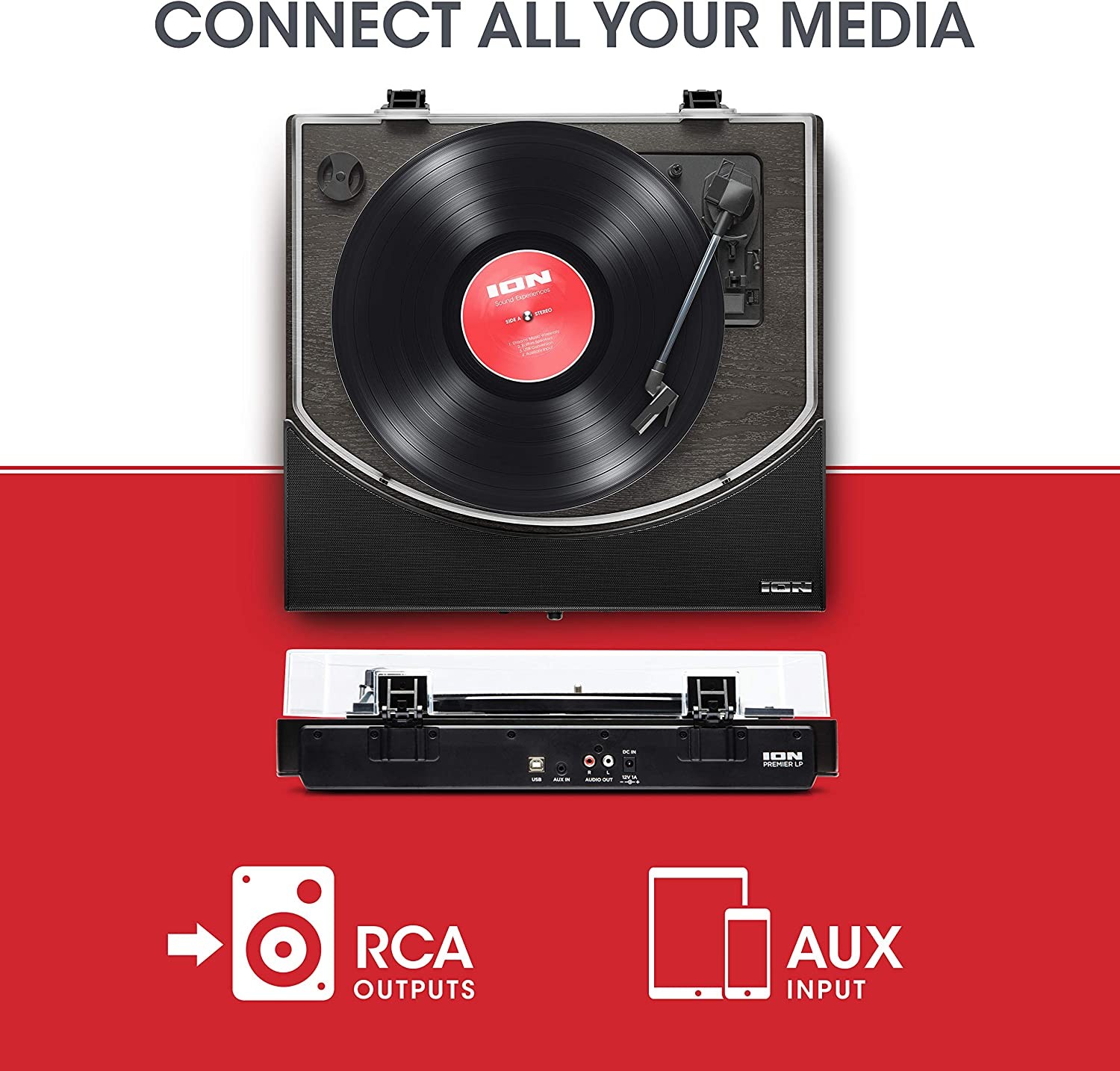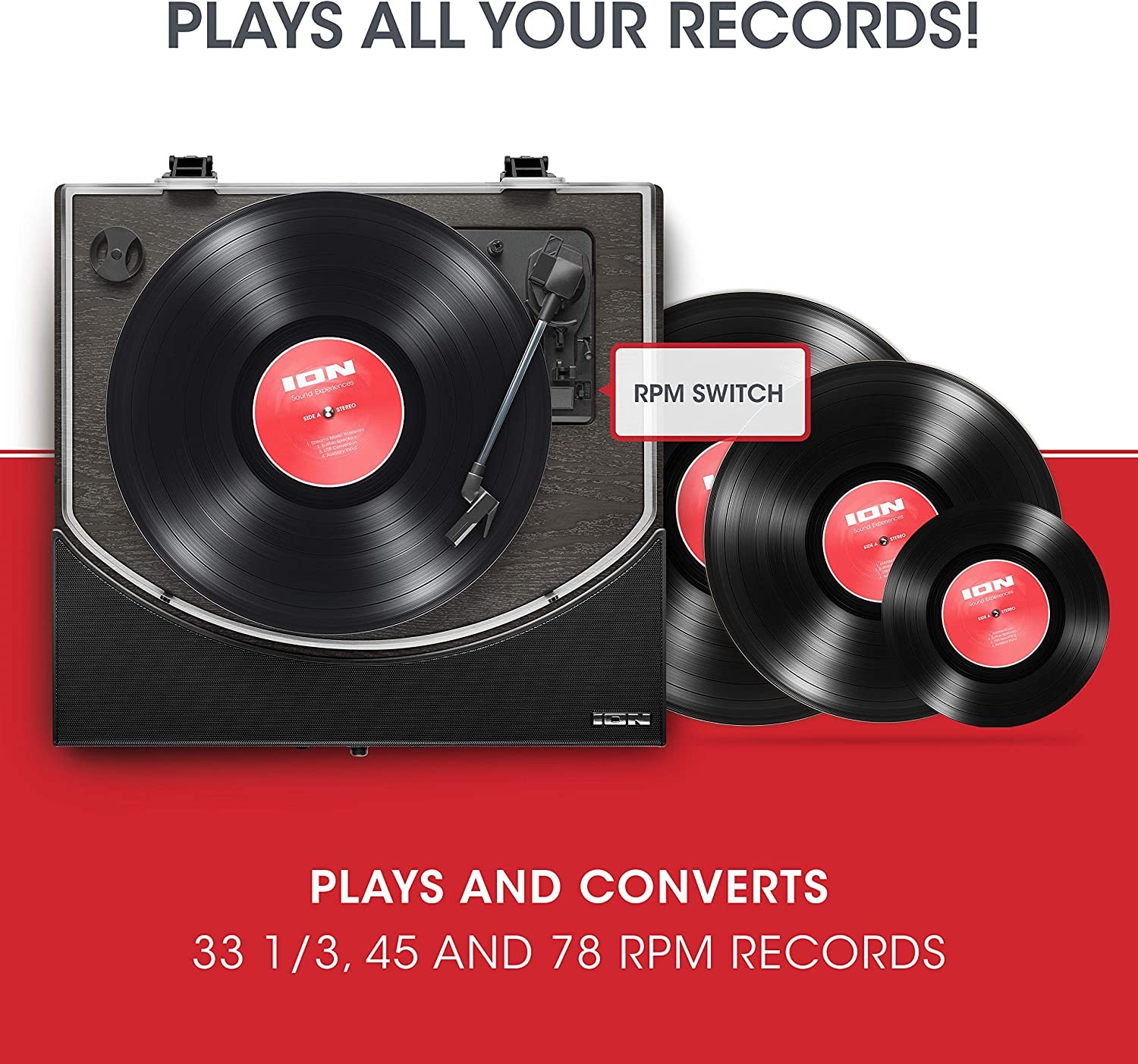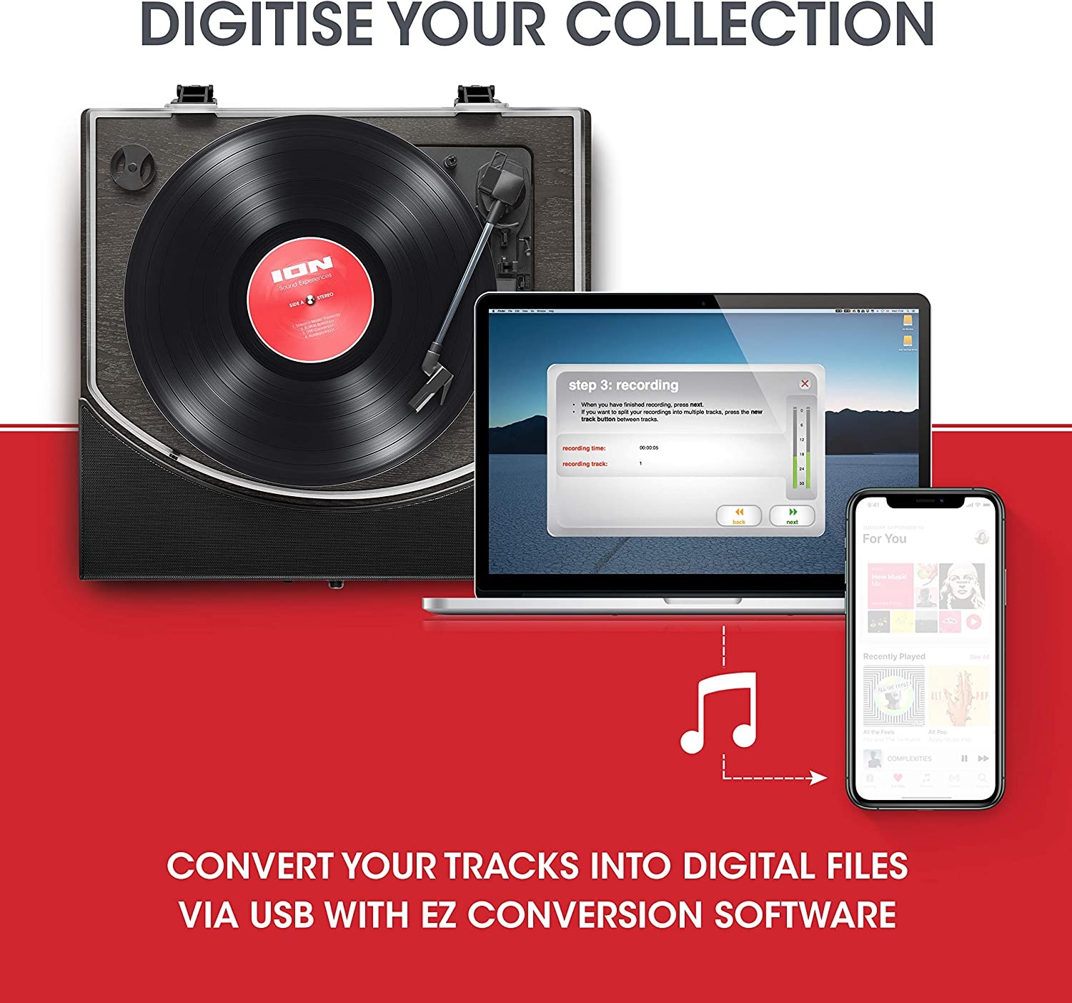 Rediscover your treasured Vinyl Record Collection – High-quality 3-speed turntable (33 1/3, 45, and 78 RPM) that plays every record in your collection, completed in a stunning black finish Bluetooth streaming - Bluetooth sends wireless signal to any Bluetooth speaker (not included); Built-in phono pre-amplifier for wired connection to non-Bluetooth speakers The centerpiece of your listening experience - 1/8-inch Aux input to connect media sources including cassette players/CD players; RCA outputs for connection to external speakers and HIFI separates Room filling sound – On-board built in speakers deliver punchy, crystal clear sound; no fuss, simply kick back and listen to your records Digitize your library - Convert tracks into digital files via USB onto your PC or Mac with the included ION Audio EZ conversion software Everything you need - Protective dust cover, 45 RPM adapter, and felt slipmat included Ensure the transit screw is turned anti-clockwise for all platter functionality to operate