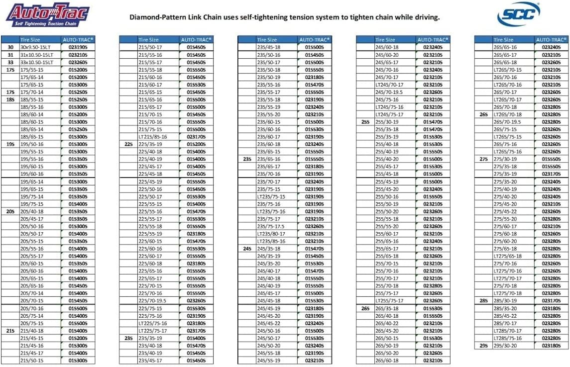 The Right Traction Product For Your Vehicle Is Determined By Tire Size However Not All Tires Are Made The Same From One Manufacturer To Another So We Strongly Suggest Doing A Test Fit To Ensure Proper Fitment Easy Installation And Removal In Minutes Do Not Exceed 30 Mph With These Chains On Diamond Pattern Cross Chain Provides A Smoother Ride And Superior Traction