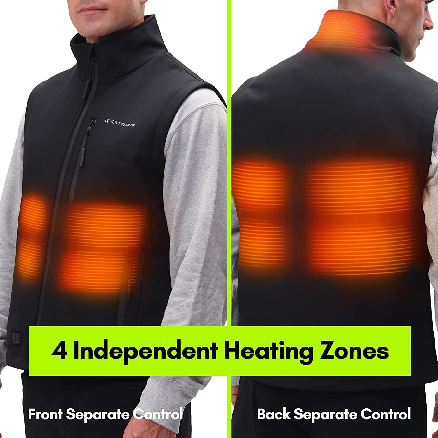 ?Customized and Flexible Heating: Made with carbon fiber, Extremus Buckwell Heated Vest flows with your movements for unrestricted mobility and even thermal conduction. The dual temperature control adjusts separate zones for your back and torso, with three heat settings maximum to 125°F (51°C), 115°F (45°C), and 104°F(40°C), respectively.