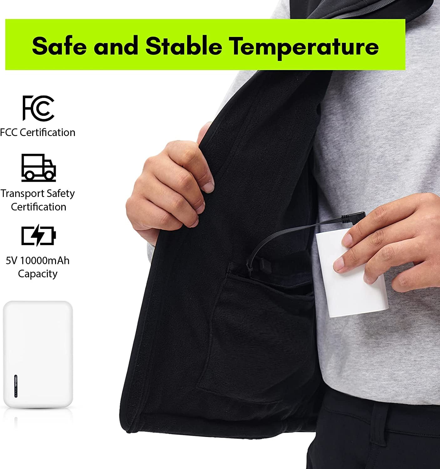 ?Keep Warm Longer: The 10000mAh power bank provides your body with consistent heat for up to 4 hours (high), 5.5 hours (medium), 8 hours (low), and up to 8 hours on a single charge. The large-capacity power bank is FCC and UN38.3 certified to guarantee safety and quality.