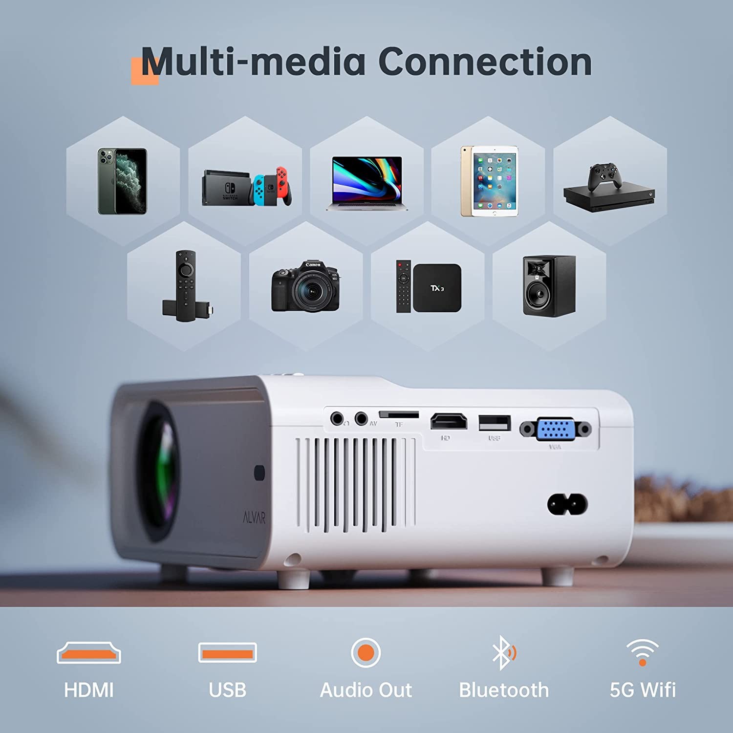 ? 【2022 Upgraded Bluetooth 5.1 and Hi-Fi Stereo Speaker】 ALVAR Bluetooth Projector has a built-in stereo surround speaker which provides the original audio fidelity. You can also connect it with Bluetooth headsets, Bluetooth speakers, and other Bluetooth devices as you want. Do1by sound is not supported. If there is no sound when playing videos, please turn off Do1by sound on your connected devices or apps (Setting>Display & Sounds>Audio>Do1by Digital Output>Turn off Do1by Digital Plus)