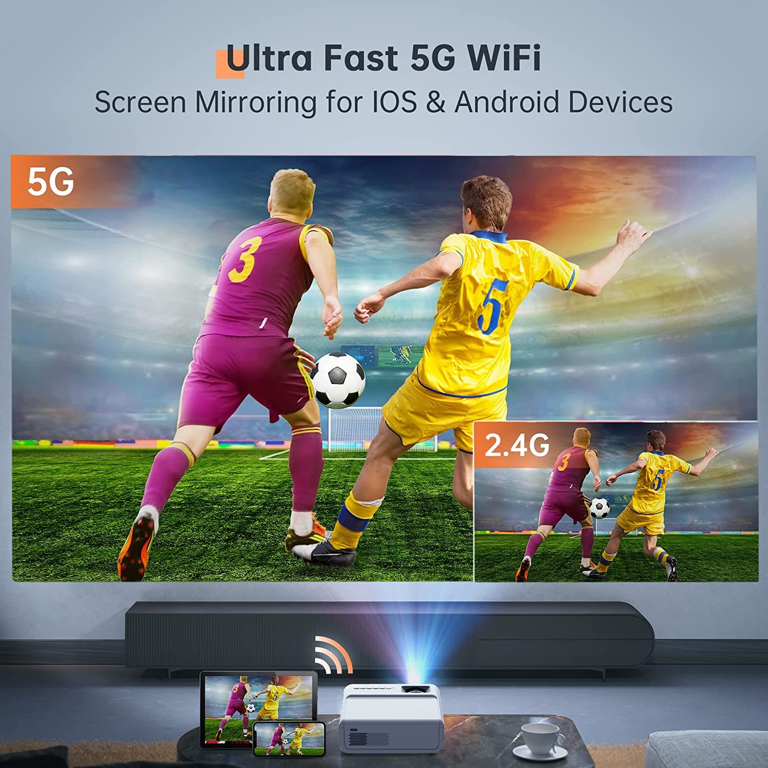 ?【5G & 2.4G WiFi Screen Mirroring】 5G and 2.4G mirroring modes. 5G bandwidth can be increased to 40MHz or even 80MHz, and the transmission speed is up to 1Gbps, which can transmit about 125MB content per second. You can instantly mirror the movies on your phone to the projector in one second with no extra adapters and dongles. NOTE: Due to copyright issues Netflix / Amazon are prohibited from playing movies. You can connect the projector with the TV Stick to watch Netflix or other videos.