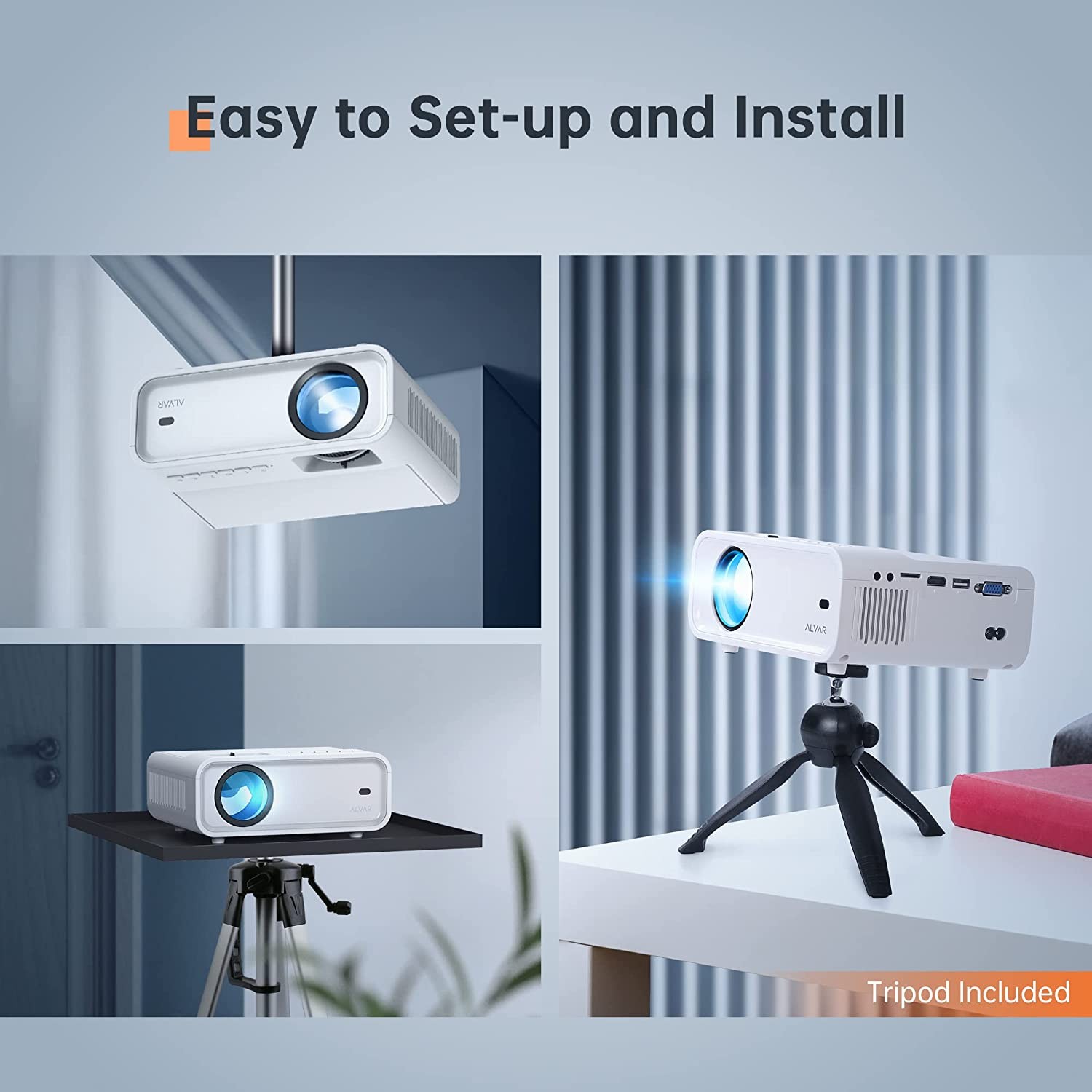 ? 【Tripod and Carrying Case Included】 ALVAR WiFi projector comes with a bag, which is easy to take out for parties and outings with your friends. Tripod also makes it easier to secure the projector in your home. It can be placed on any table and is very simple to install. The projector also has screw holes for mounting upside down on the roof.