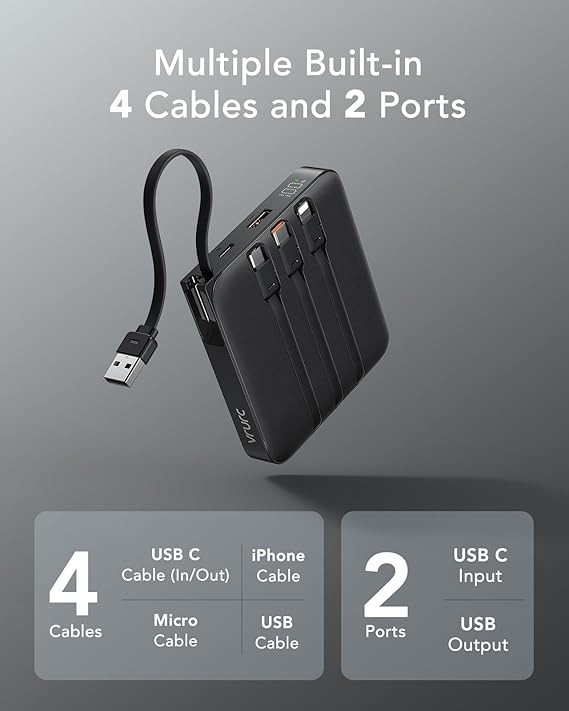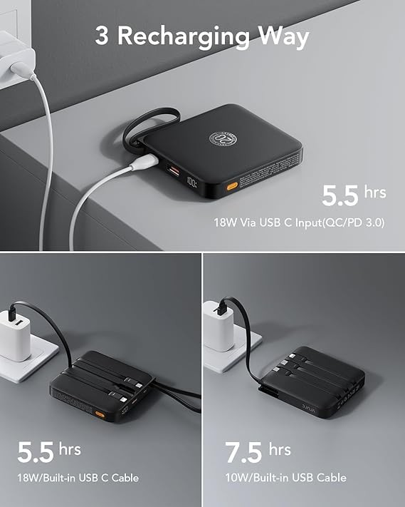 ⚡【Re-charge in 3 Ways】Recharge our power bank in just 5.5 hours through the built-in USB-C cable (18W), via USB-C Input (QC/PD 3.0) at 18W, or use the built-in USB cable for a full recharge in 11 hours (10W)
