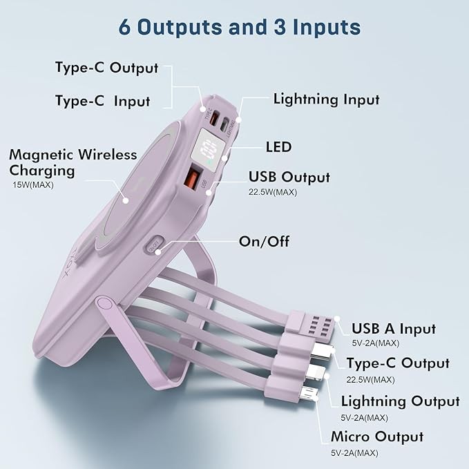• 【6 Outputs and 3 Inputs】Wireless Portable charger has 6 outputs and 3 inputs, you may charge 6 devices max at the same time, recharge battery pack with 3 input options easily. Magnetic wireless charger built-in 3 output cables and 2 outputs port(1 USB-C port and 1 USB-A port) and 1 magnetic wireless charging (Total 6 outputs), great for multi electronics users who has iPhone, android or micro devices. It also built-in 3 inputs (1 built-in USB-A recharging cord/cable, 1 USB-C input, 1 iPhone input), which you can use any one of them to recharge Mag-safe battery pack conveniently.
