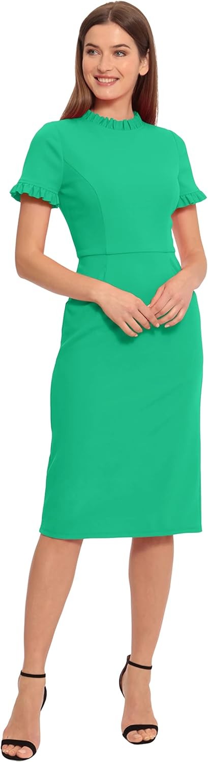 Ruffle details at jewel neck & short sleeve hems, princess seams and waist seam, and below the knee pencil skirt with back slit.