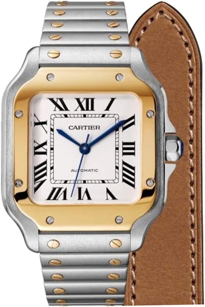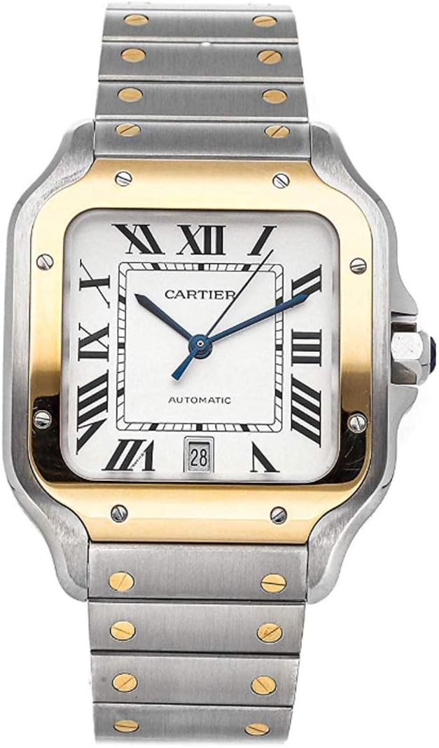 Silvered Opaline dial enhanced by blued-steel sword-shaped hands. Silver-tone stainless steel case with a silver-tone stainless steel and 18kt yellow gold band. Automatic movement. 100 meters / 330 feet water resistance. Fixed bezel. Scratch Resistant Sapphire crystal. Solid caseback. Fold Over with Push Button Release clasp. Pull / Push crown. Case size 39.8 mm x 9.08 mm. Cartier W2SA0006 Santos Watch.