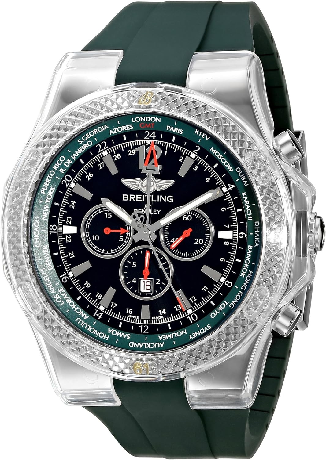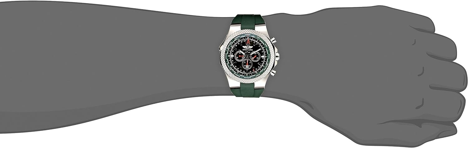 Stainless steel case with a green rubber strap. Bidirectional stainless steel bezel. Royal ebony dial with luminous hands and index hour markers. Arabic numeral marks the 12 o'clock position. GMT markings. World time around the outer rim. Dial Type: Analog. Date display appears at the 6 o'clock position. Chronograph - three sub-dials displaying: 60 seconds, 15 minutes and 6 hours totalizers. Self-winding automatic movement. Scratch resistant sapphire crystal. Solid case back. Case diameter: 49 mm. Case thickness: 14.5 mm. Folding clasp. Water resistant at 100 meters /330 feet. Functions: hours, minutes, seconds, date, chronograph, GMT, world time. Additional Info: GMT, chronograph functions. Breitling Bentley GMT Green Dial Chronograph Mens Watch A47362S4-B919GRRD.