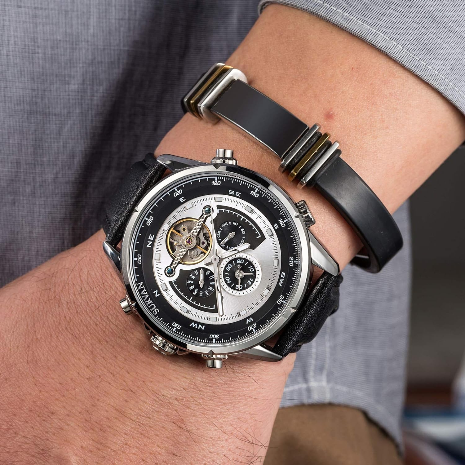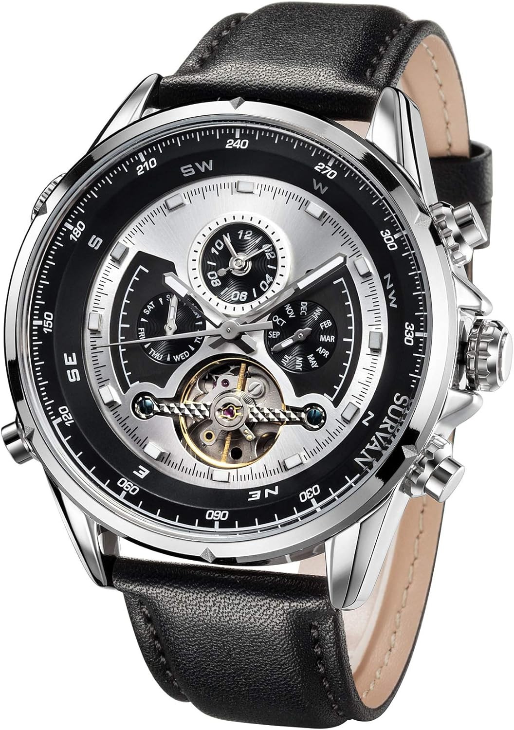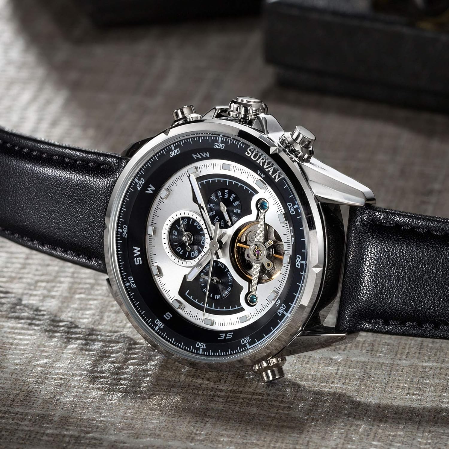 SURVAN WatchDesigner Men's Automatic Watch Dual Time Zone Mechanical Skeleton Watch Genuine Leather Strap
