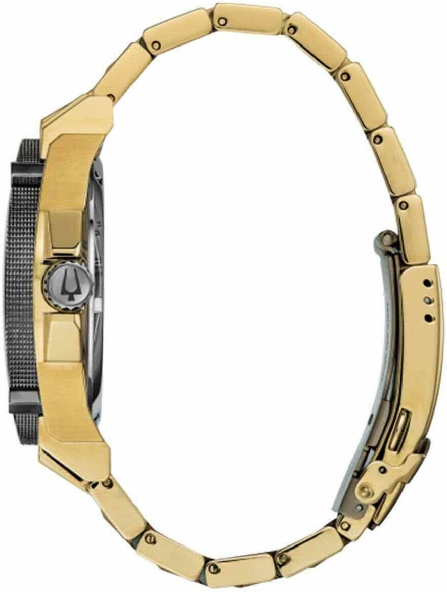 Be punctual in style with this bold and handsome watch from Bulova's Precisionist Collection. The Precisionist Collection features watches that use a super-high frequency to keep accurate time to 1/1000th of a second. Bulova's exclusive quartz crystal Precisionist three-hand calendar movement uses a 262 kHz vibrational frequency, which is eight times greater than those used in standard timepieces. The watch's patterned black and grey dial boasts 11 diamonds as hour markers, as well as the Precisionist line's hallmark: the continuously sweeping second hand. The multi-level carbon fiber dial also showcases a date window and luminous hands. Also featured is a screw-back case, curved crystal, a screw-down crown, and a water resistance of 300 meters. Completing the look is gold-tone stainless steel bracelet that comfortably secures with sport fold-over buckle closure. Features: 46.5mm gold-tone stainless steel screwback case, Quartz crystal Precisionist three-hand calendar movement with a 262 kHz vibrational frequency, Black multi-level carbon fiber dial with luminous hands, 11 diamond hour markers, Date window, Sweeping second hand, Curved mineral crystal, Screw-down crown, 300 meter water resistance, Gold-tone stainless steel bracelet with sport fold-over buckle closure, Bulova Style #: 98D156