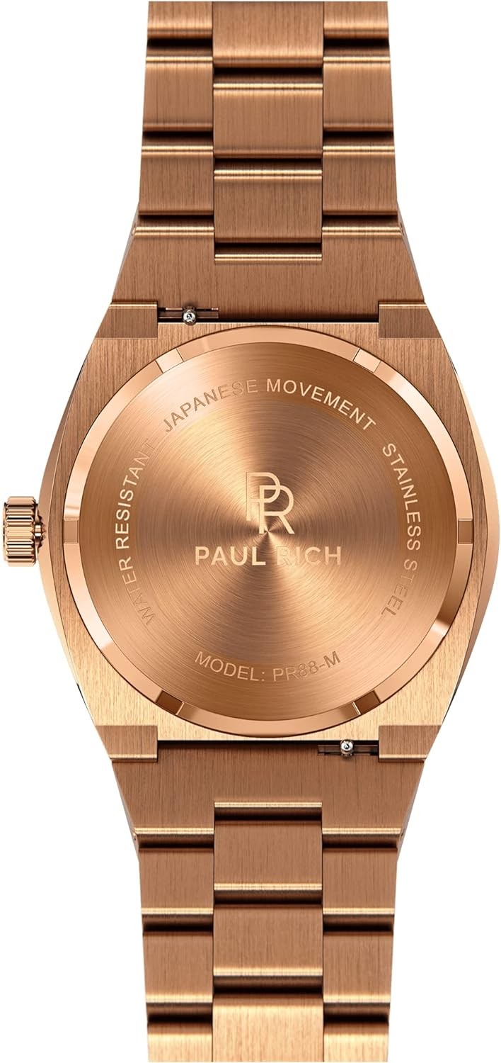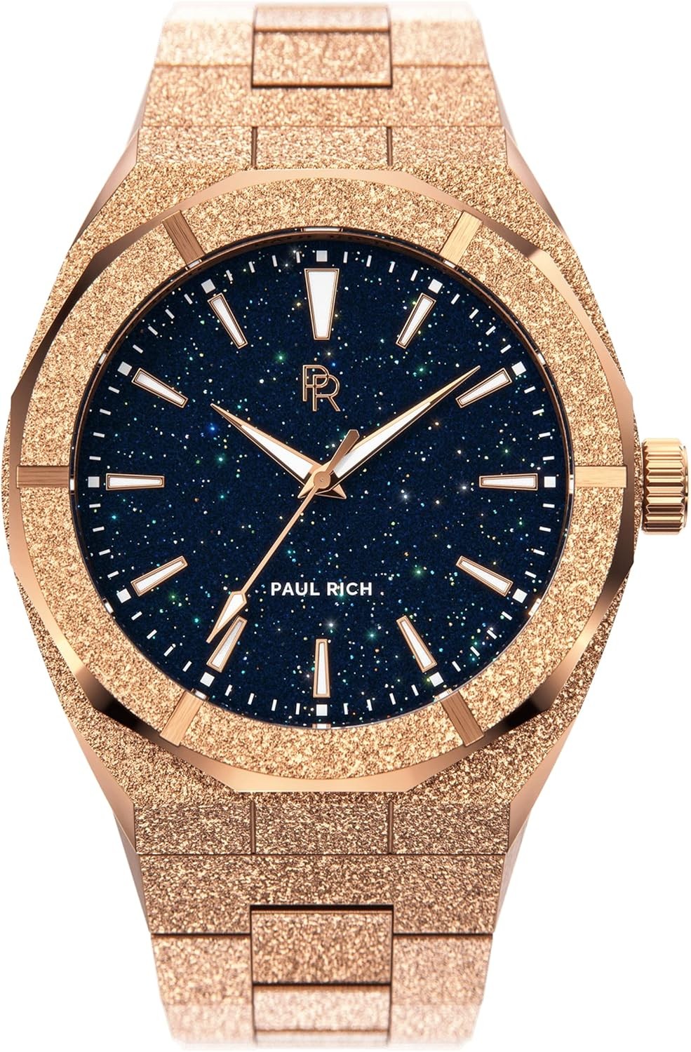 With its frosted case and dazzling aventurine dial, the Paul Rich Frosted Stardust Men's Dress Watch takes inspiration from the universe and redefines brilliance. They remind you to maintain an icy demeanor as you pursue your desires. Add to that the luminous hands and hour markers, and you have the equivalent of a North Star to guide you in your pursuit of excellence. In addition to being beautiful, our men's watches feature state-of-the-art Japanese Miyota quartz or automatic movements and top-notch horology craftsmanship that is highly accurate and reliable. Stylish and resilient, the men's frosted Stardust dress watch is known for its majestic appearance. The surface is made of Corning Gorilla Glass crystal, which is thin, light and damage-resistant. The straps are 20mm wide and interchangeable. Since transactions don't always take place in the comfort of the office, these Paul Rich watches are water-resistant to 5 ATM and can withstand pressure equivalent to a depth of 50 meters. A Stylish Watch for Every Occasion The Paul Rich Frosted Stardust Watch is available in gold, silver, rose gold and black cases, with a choice of blue or green dial. Men's stainless steel watch features a fashion-forward style that pairs perfectly with both power suits and casual attire. Each men's watch comes in an elegant presentation box.