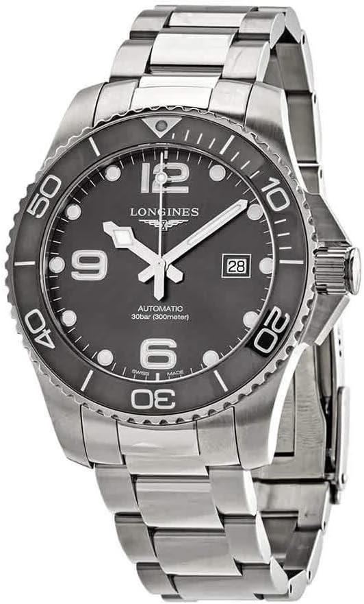 Sunray Grey dial. Silver-tone stainless steel case with a silver-tone stainless steel band. Automatic movement. 300 meters / 1000 feet water resistance. Uni-directional Rotating bezel. Fold Over with Safety Release clasp. Case size 43 mm. Longines L3.782.4.76.6 Hydroconquest Watch.