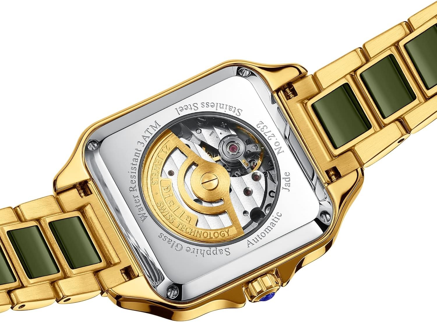 Diella Rectangle Mens Wrist Watch, Automatic Self Winding Watches for Men with Jade & Stainless Steel Watch, Roman Numerals Analog Watch with Date, Waterproof