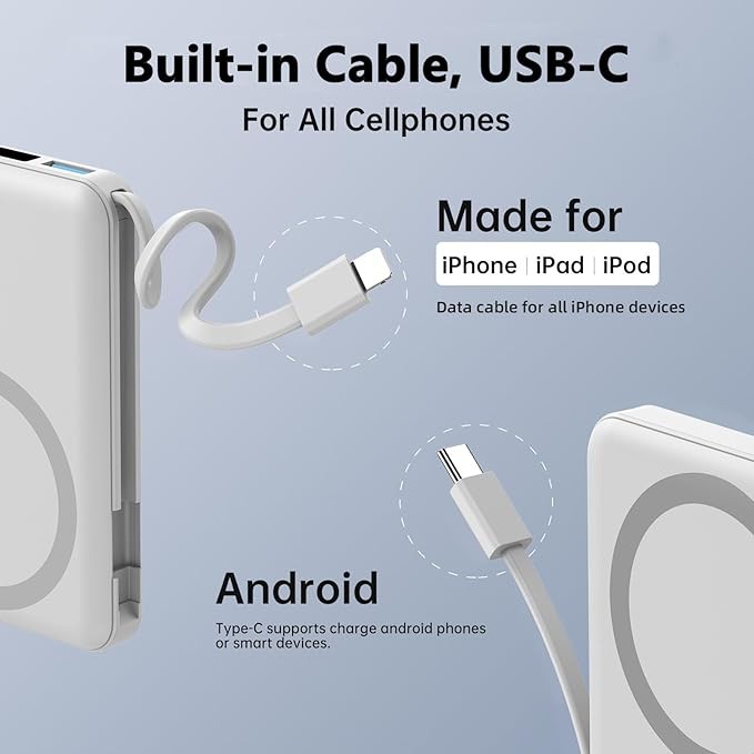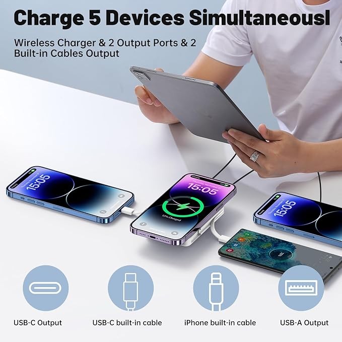 • 【Portable Charger with Built in Cables】: The portable phone charger has two built-in cables and one USB output port to power up to 5 devices at the same time, Supports 7.5W, 10W and 15W Max wireless charging, 22.5W Max USB PD and 20W USB-C output